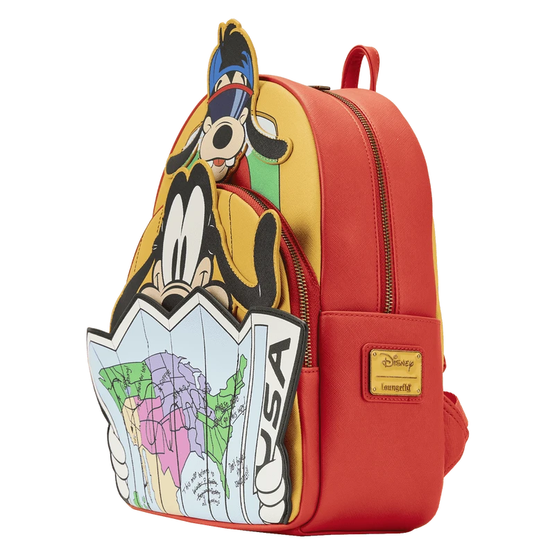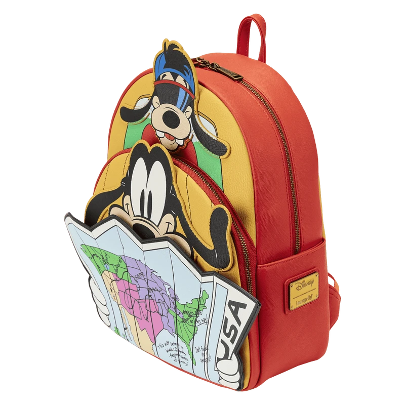 The Loungefly A Goofy Movie Road Trip Mini Backpack is made of vegan leather (polyurethane). Bag has adjustable shoulder straps and sturdy metal hardware. Additional features include applique and printed details. Take note of the coordinating inside lining.