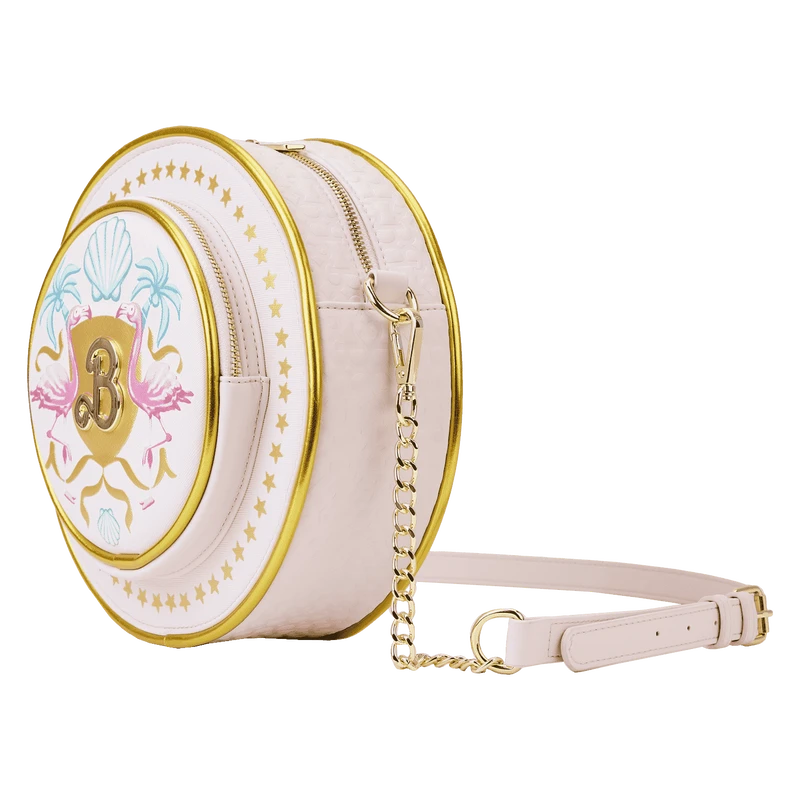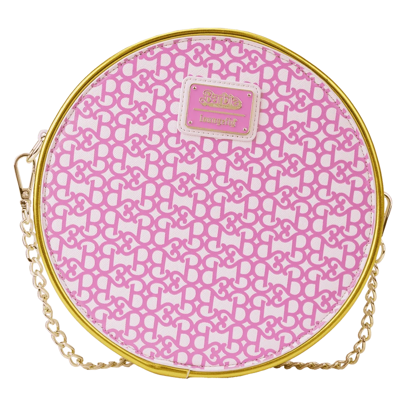 The Loungefly Mattel Barbie: The Movie Logo Crossbody Bag is made of vegan leather (polyurethane). Bag has a gold chain with an adjustable shoulder strap (detachable) and sturdy gold-colored metal hardware. Additional features include applique, debossed, gold foil, and printed details. Take note of the coordinating inside lining.