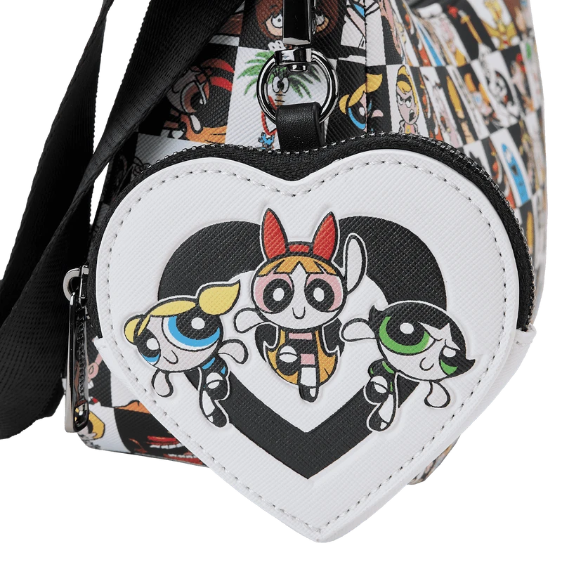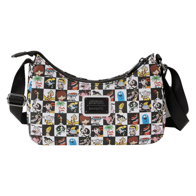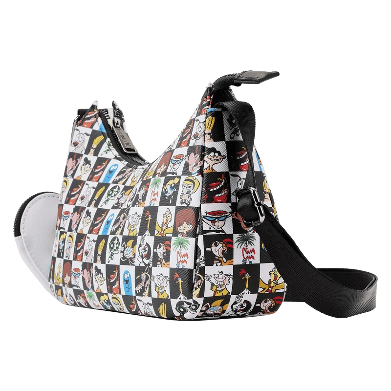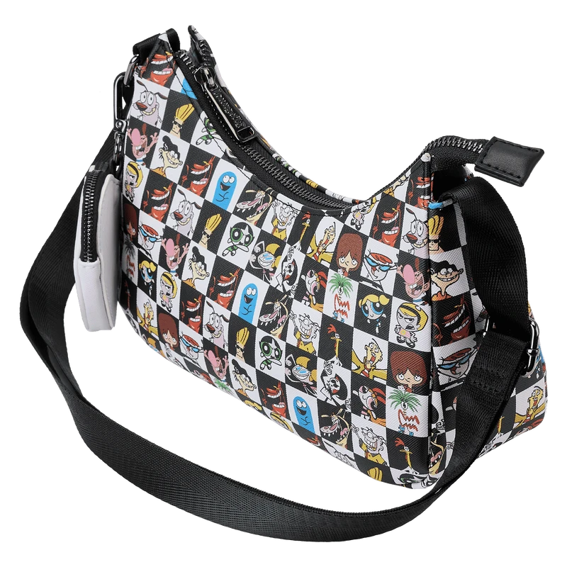 The Loungefly Cartoon Network Retro Collage Crossbody Bag with Coin Pouch is made of vegan leather (polyurethane). Bag has adjustable shoulder strap and sturdy metal hardware. Additional features include applique and printed details. Take note of the coordinating inside lining.
