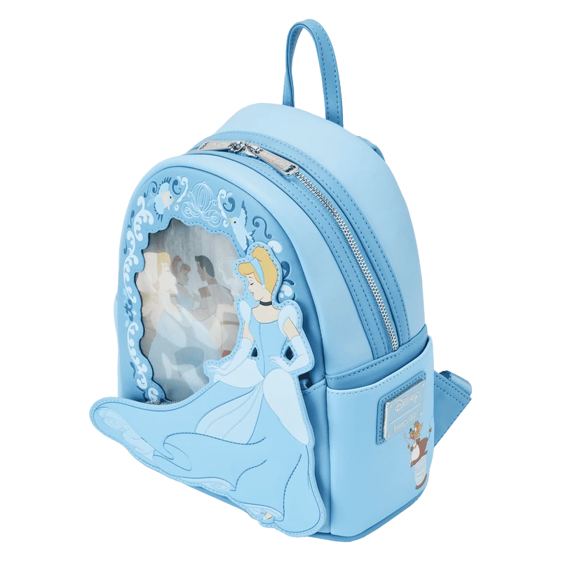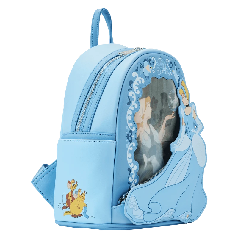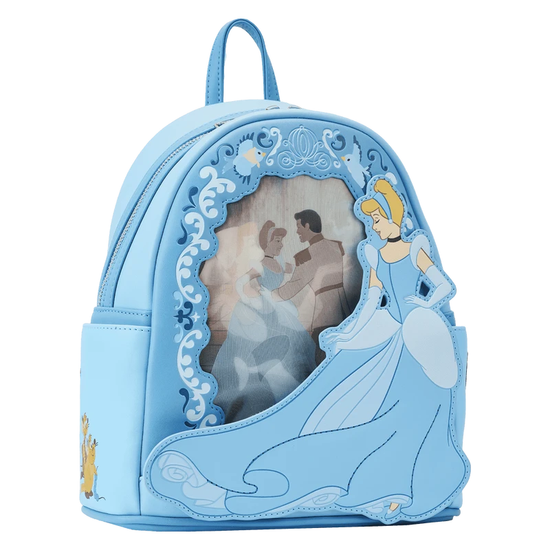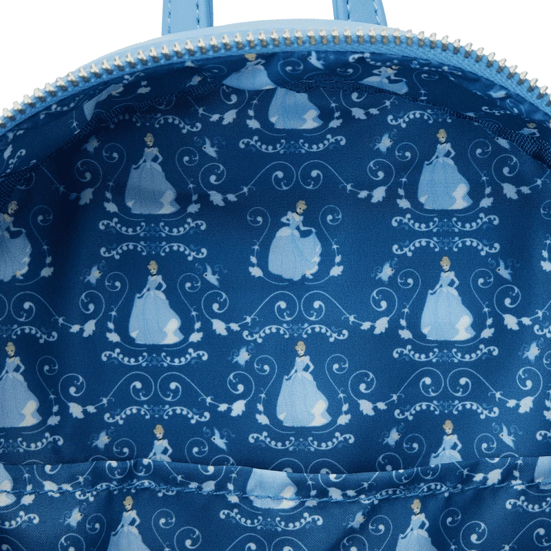 Backpack features include sturdy shiny gold-colored metal hardware, adjustable straps, vegan leather (polyurethane), side pockets, and applique, debossed, lenticular, and printed details. Note the coordinating lining.