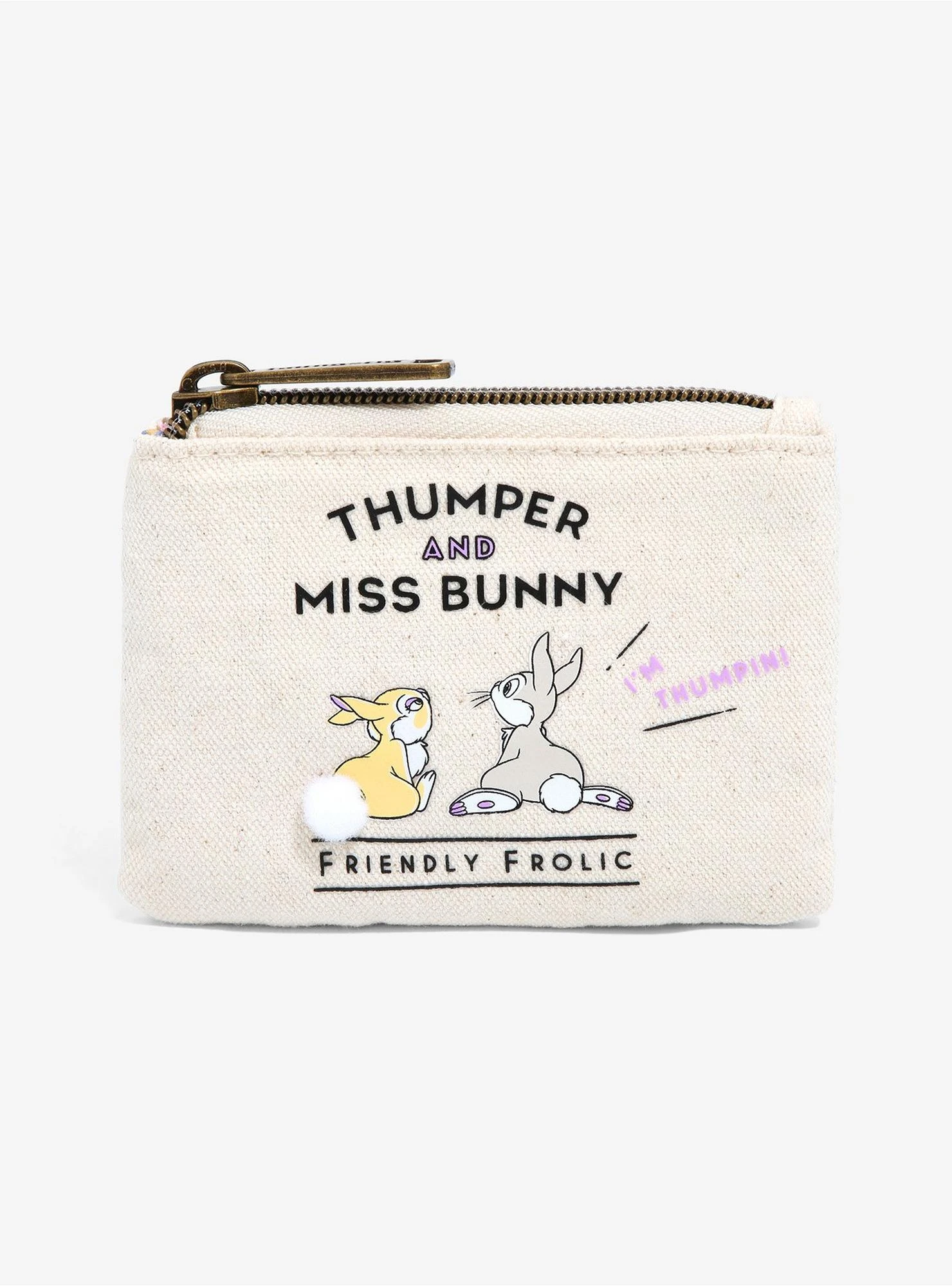 Here’s a Bambi-inspired accessory that’s just thumpin’ with style! Inspired by the animated Disney classic, Thumper and Miss Bunny adorn this Loungefly coin purse between “Thumper and Miss Bunny” and “Friendly Frolic” lettering. Complete with a fur ball appliqué for Miss Bunny’s tail, this coin purse also features a bronze-toned zipper closure at the top and a floral interior lining pattern.