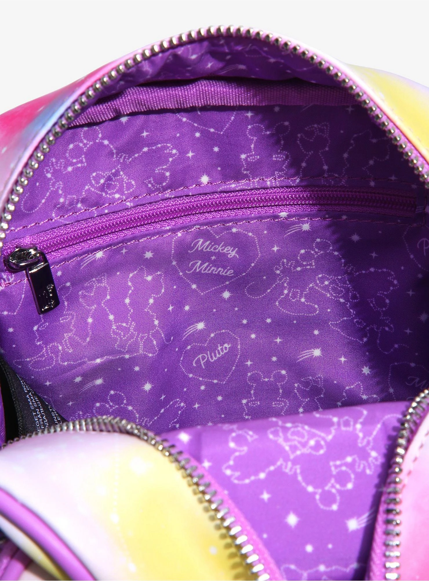 Take your style levels sky high with a little help from Minnie, Mickey, and Pluto! Featured gazing at the embroidered constellations on the front of this Loungefly crossbody bag, the Disney trio stand in front of a colorful and starry sky for one style worth wishing for. Also features silver-toned hardware, an enamel brand badge, an adjustable shoulder strap, and a constellation-inspired interior lining pattern. Look closely and you might see a few Mouse Eared designs and Pluto’s bone in the stars!