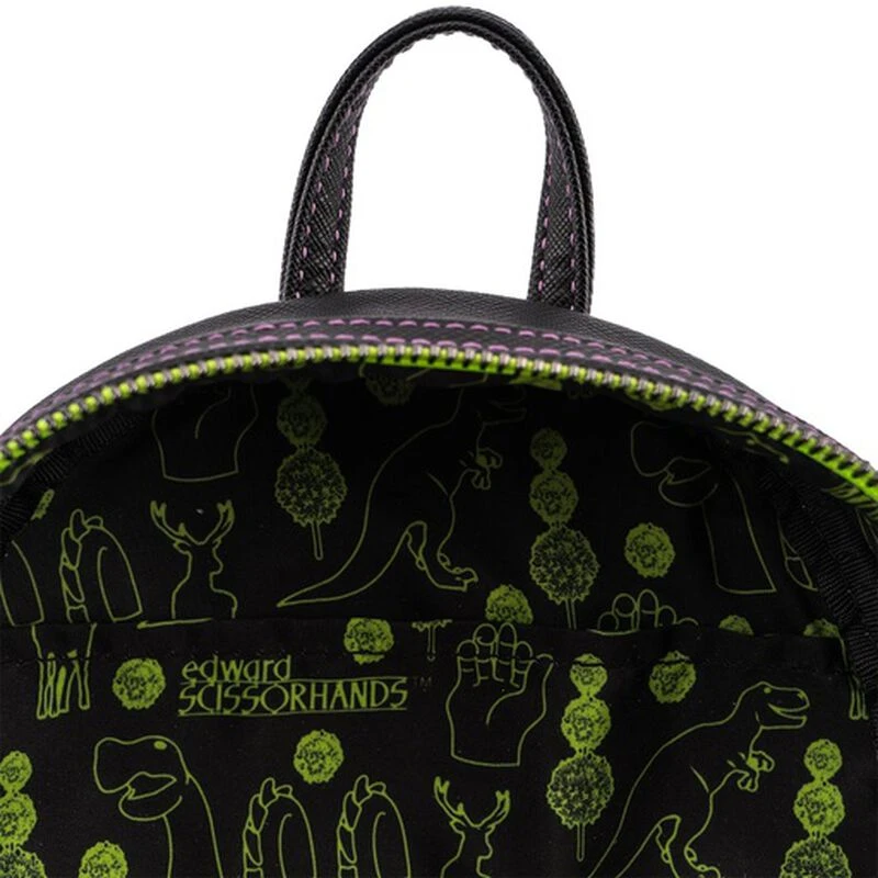 Edward Scissorhands seems to have taken his lawncare job very seriously on this Loungefly Edward Scissorhands Topiaries Mini Backpack. In the foreground of the garden you’ll find Edward standing next to his wonderfully creative dinosaur hedge. The hedges are even textured with soft chenille fabric. Down the garden path you’ll see more masterfully manicured hedges among many beautiful flowers. This design is sure to delight any who encounter it!