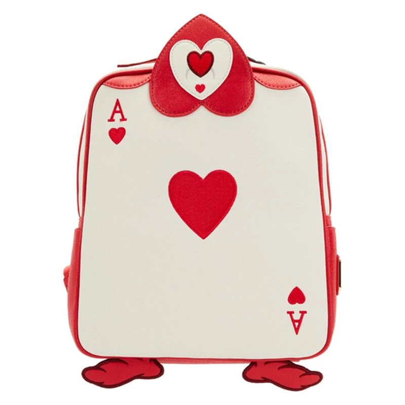 Paint the roses red with the Ace of Hearts from this Exclusive Loungefly Disney Alice in Wonderland Ace of Hearts Cosplay Mini Backpack. The Ace of Hearts comes to life in applique and embroidered detail, with a head that peeks up over the top of the body of the backpack and red stocking feet that stick out below. Glitter adds sparkle to the white background, and an enamel zipper charm of a bucket of red paint and a brush completes the scene with suspense: Will the roses get painted before the Red Queen arrives? If you, and the Ace of Hearts, play your cards right, all will be well. In fact, on the back, the Red Queen arrives to inspect the royal gardens, and Alice offers a curtsey. It’s the perfect accessory for any Disney outfit—or for turning everyday outings into magical adventures. Act fast to collect this exclusive accessory; supplies are limited.