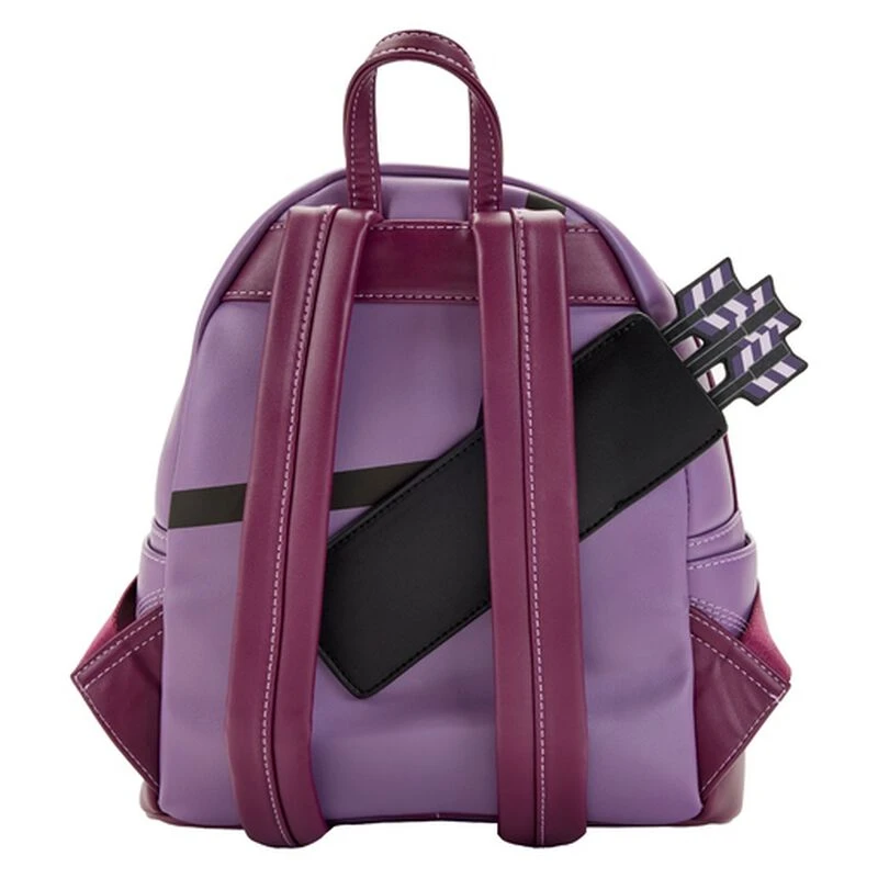 Make a heroic entrance wherever you go with the Loungefly Hawkeye Kate Bishop Cosplay Mini Backpack. This exclusive mini backpack reflects the details of Kate Bishop’s purple hero suit. On the front, Kate’s quiver strap crosses the top of her uniform while her utility belt stretches across the zipper pocket, connected by a metal ring. Kate’s arrows are ready for action as they peek out from the quiver on the bag’s back. This accessory has room to carry all your gear as you hit the ground running on any adventure. Act fast to collect; supplies are limited.