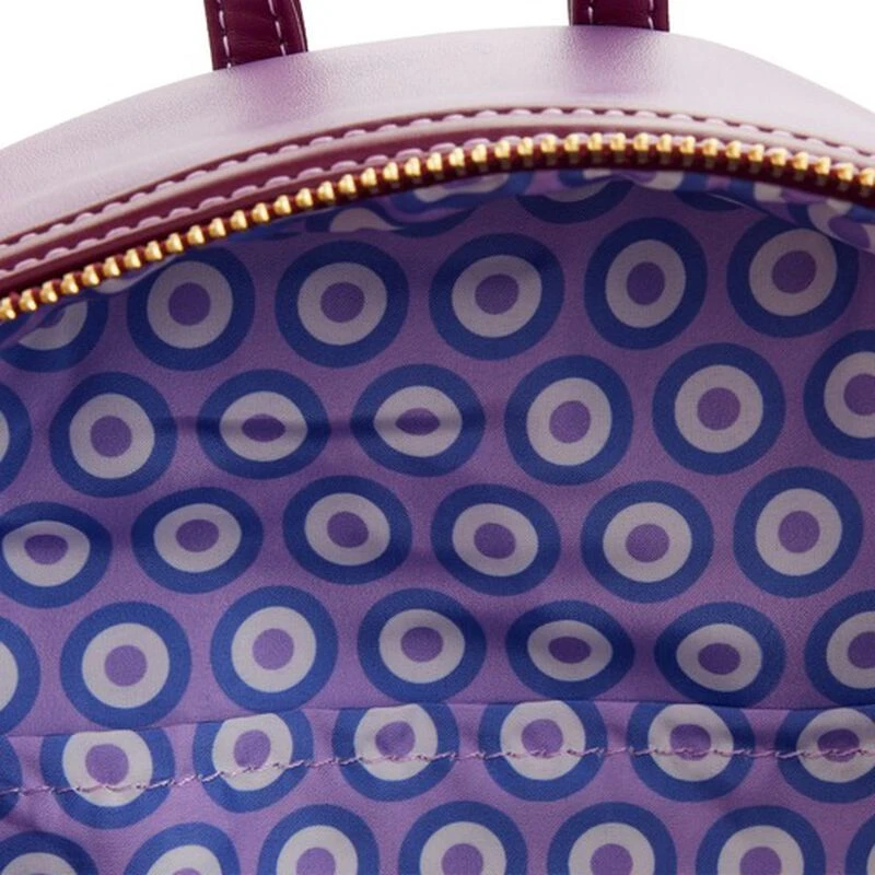 The Loungefly Hawkeye Kate Bishop Cosplay Mini Backpack is made of vegan leather (polyurethane). Bag has adjustable shoulder straps and sturdy metal hardware. Additional features include applique, debossed, printed, and 3D metal ring details. Take note of the coordinating inside lining.