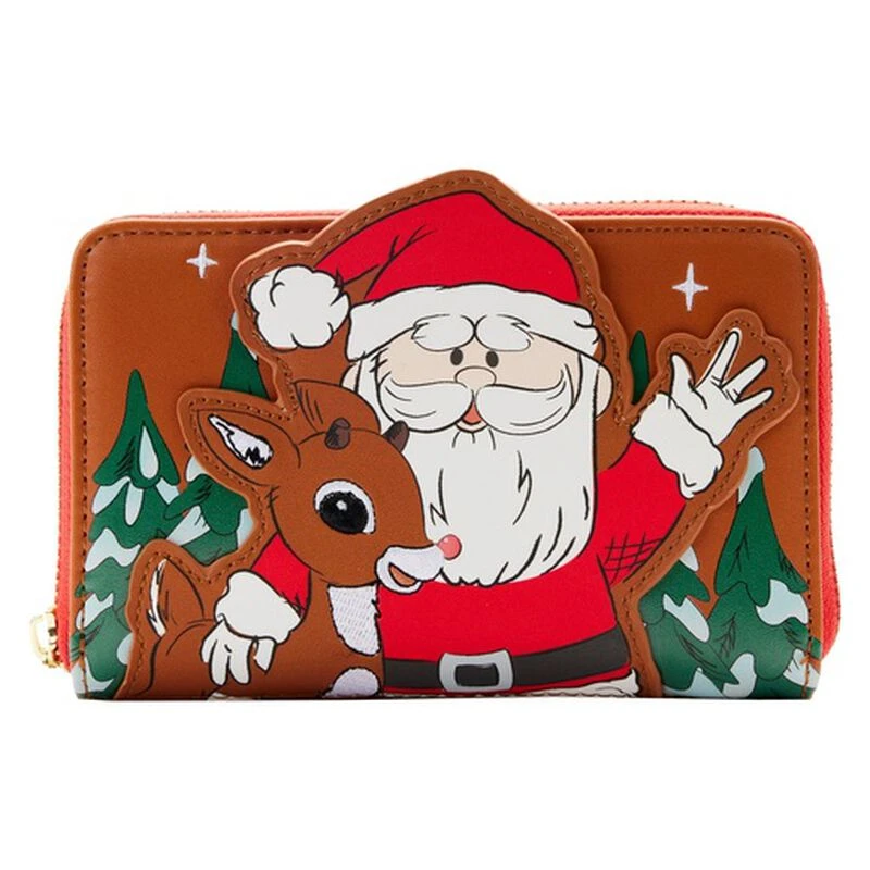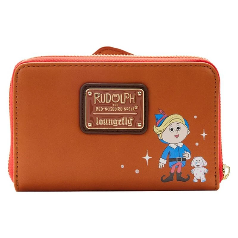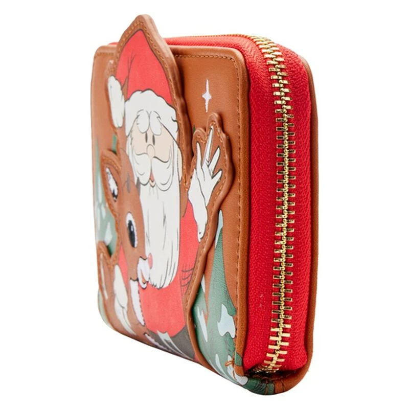 The Loungefly Rudolph the Red-Nosed Reindeer Santa and Rudolph Cosplay Zip Around Wallet is made of vegan leather (polyurethane). Wallet zips closed, has sturdy gold-colored metal hardware, and features applique, printed, embroidered, and glow-in-the-dark details. Take note of the coordinating pattern of the inside lining fabric.