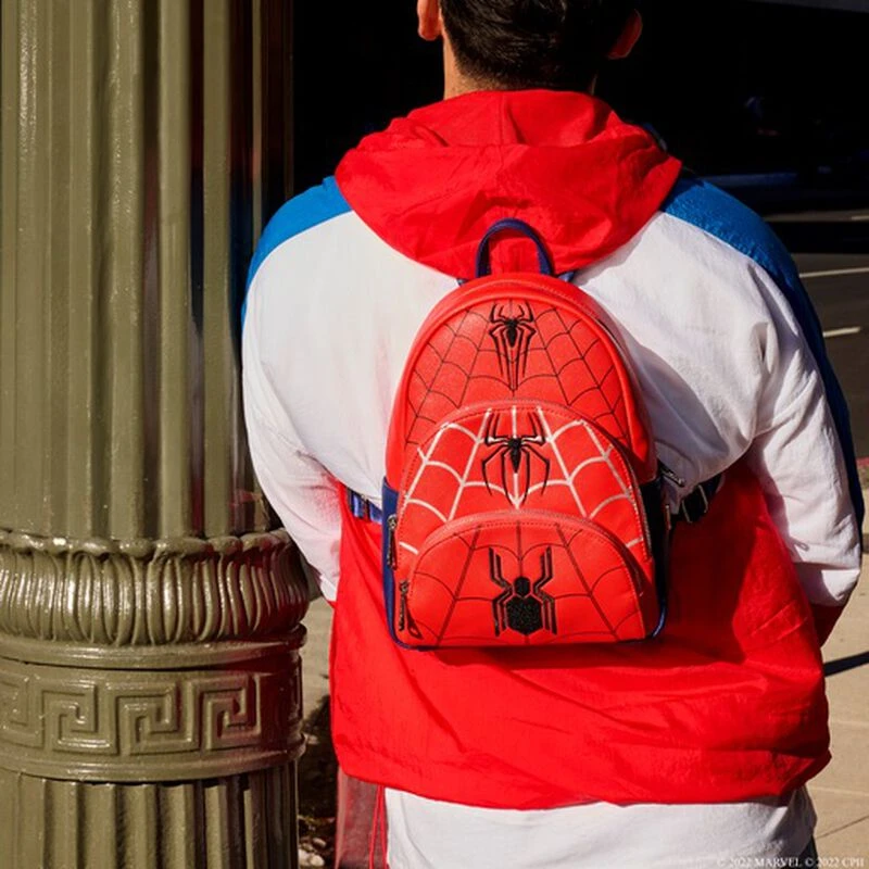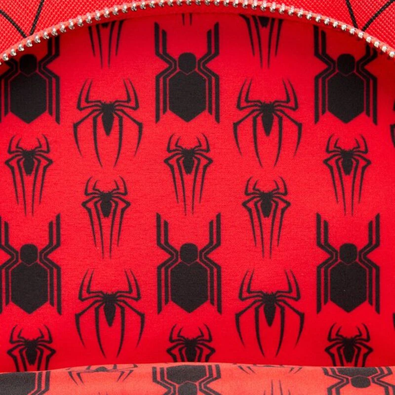 The Loungefly Spider-Man Triple Pocket Multi Logo Mini Backpack is made of Saffiano vegan leather (polyurethane). Bag has adjustable shoulder straps and sturdy metal hardware. Additional features include embroidered, foil, and printed details. Take note of the coordinating inside lining.