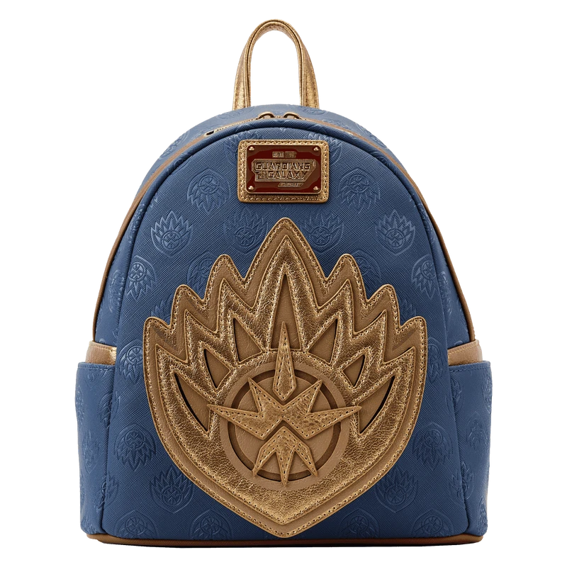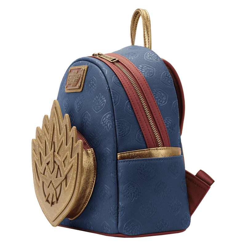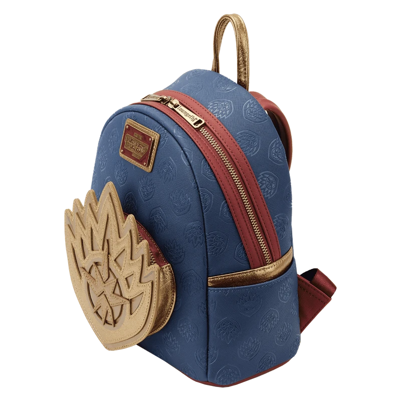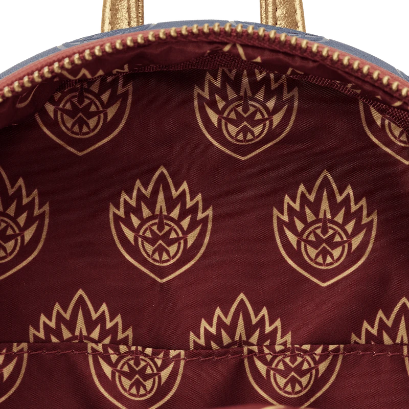 The Loungefly Guardians of the Galaxy Volume 3 Ravager Badge Mini Backpack is made of vegan leather (polyurethane). Bag has adjustable shoulder straps and antique brass-colored hardware. Additional features include applique, debossed, embossed, and printed detail. Take note of the coordinating inside lining.