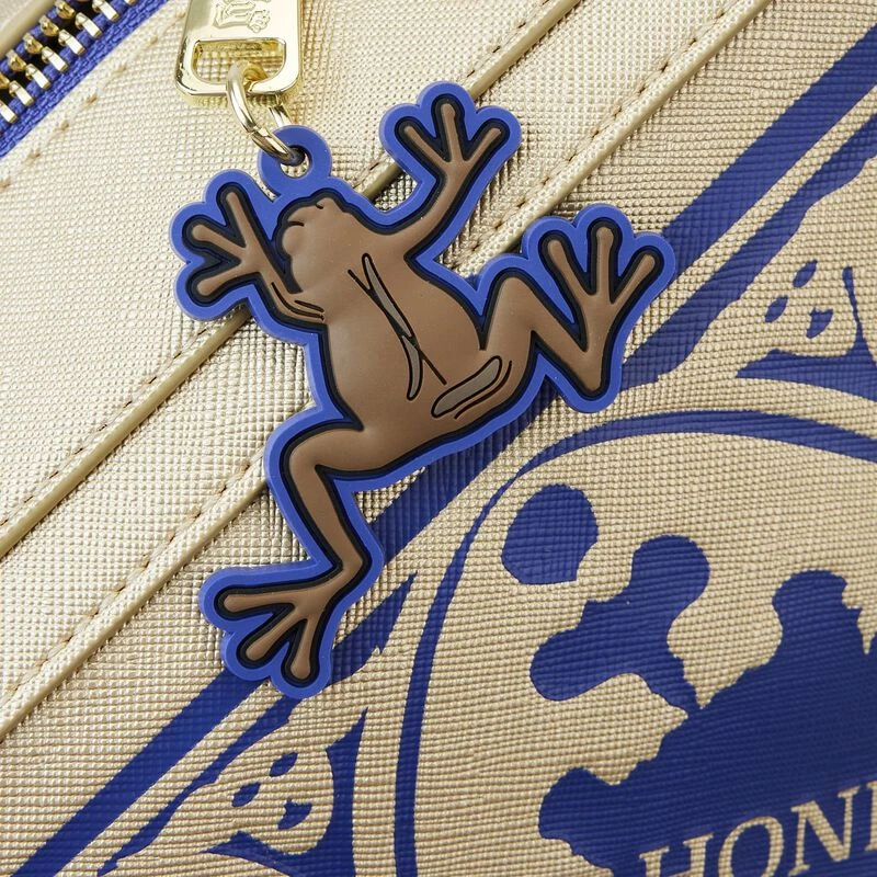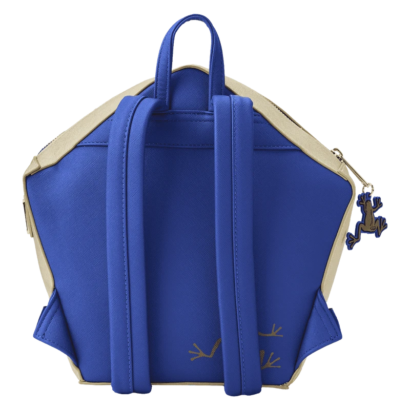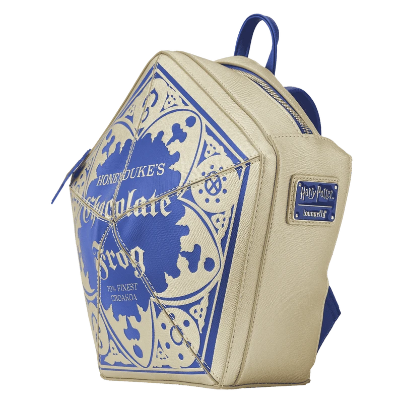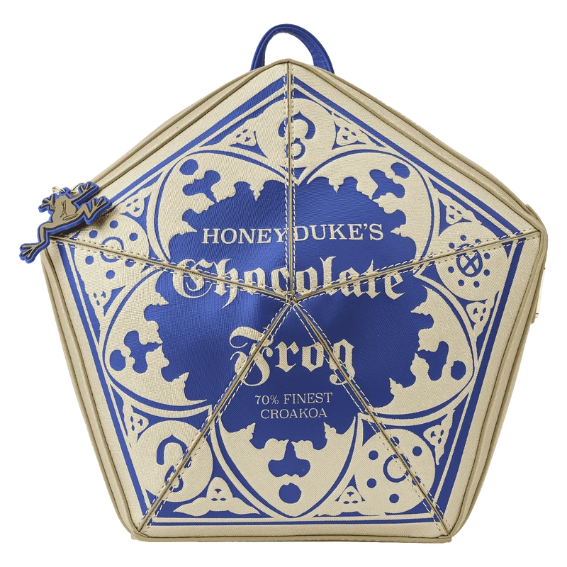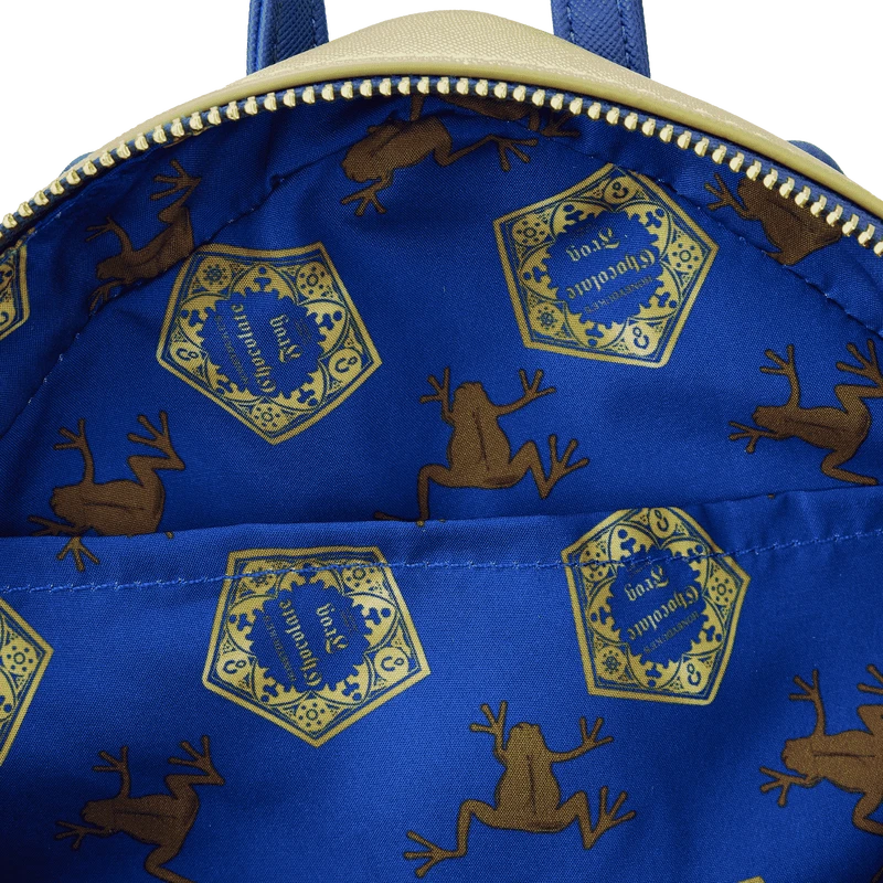 Backpack features include sturdy shiny gold-colored metal hardware, adjustable straps, vegan leather (polyurethane), a silicone charm, and debossed, scented, gold metallic, and printed details. Note the coordinating lining.