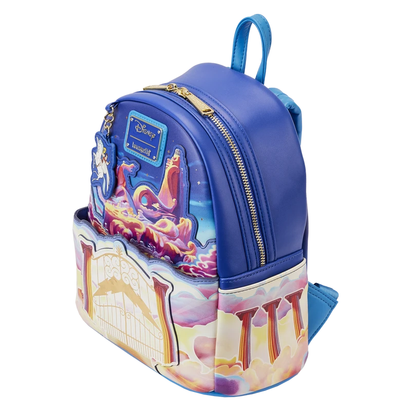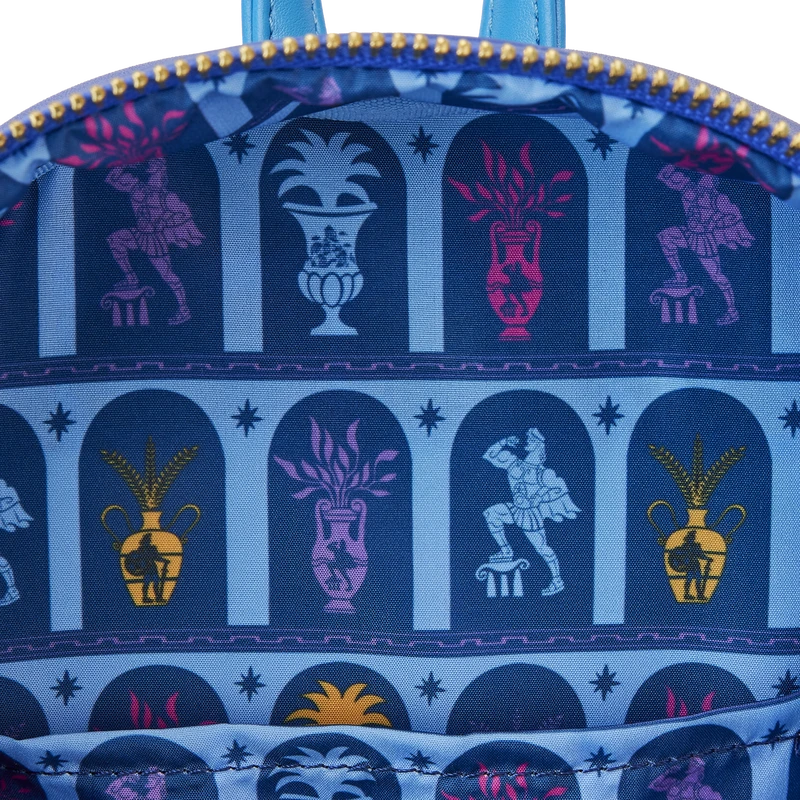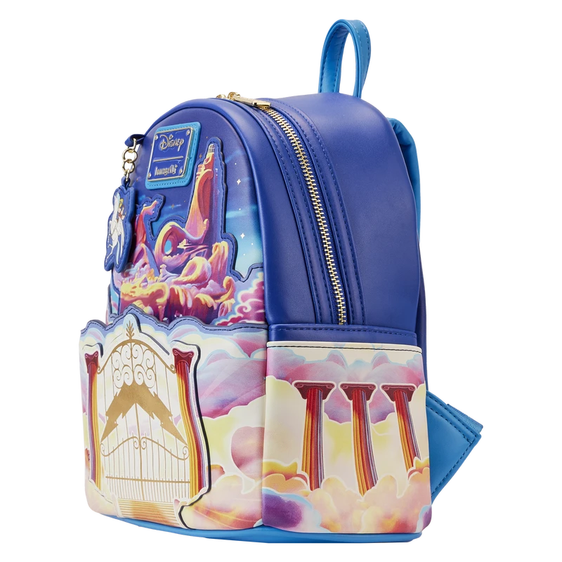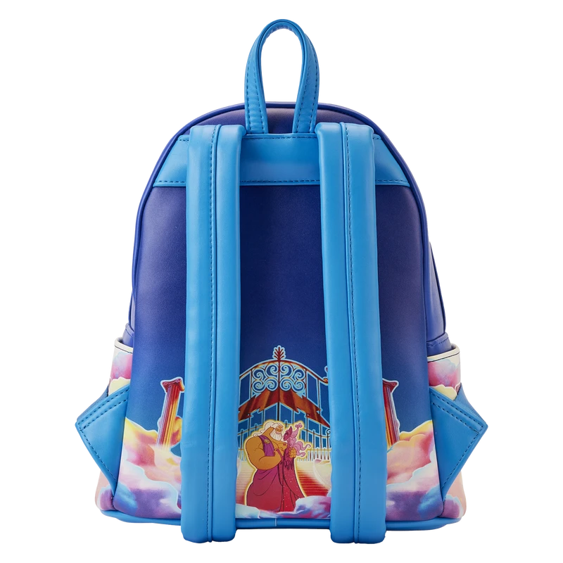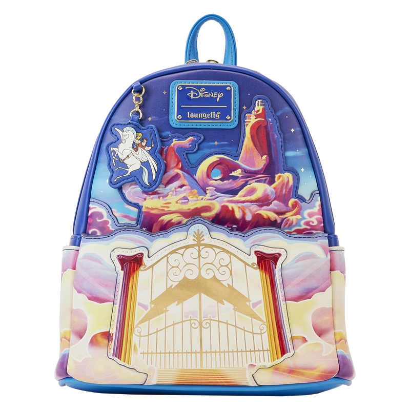 Open the gates and take your journeys to heroic heights! Our Loungefly Disney Hercules Mount Olympus Golden Gates Mini Backpack is a dreamy vision. On the front, Mount Olympus rises above the clouds, and the golden gates stand before them in applique detail. A die-cut drop pocket, behind a few of the fluffy clouds, creates extra room for storing smaller items on your excursions. A vegan leather zipper charm of Hercules and Pegasus adds a touch of adventure. Cloud and column details continue on the side pockets, and on the back, you’ll find Zeus and Hera, embracing before the golden gates. It’s the perfect accessory for a hero’s journey—or for turning everyday outings into spectacular moments.