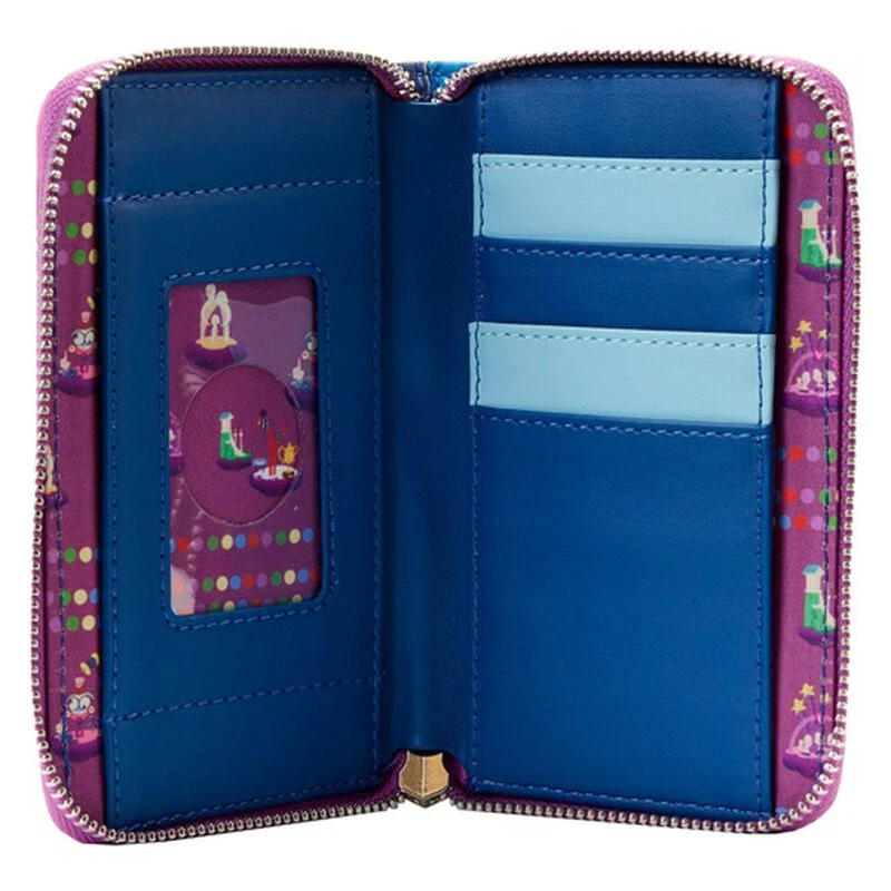 The Loungefly Inside Out Control Panel Zip Around Wallet is made of vegan leather (polyurethane). Wallet zips closed with sturdy metal hardware. Additional features include applique, glow-in-the-dark, and printed details. Take note of the coordinating inside lining.