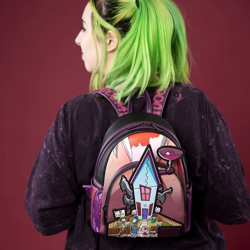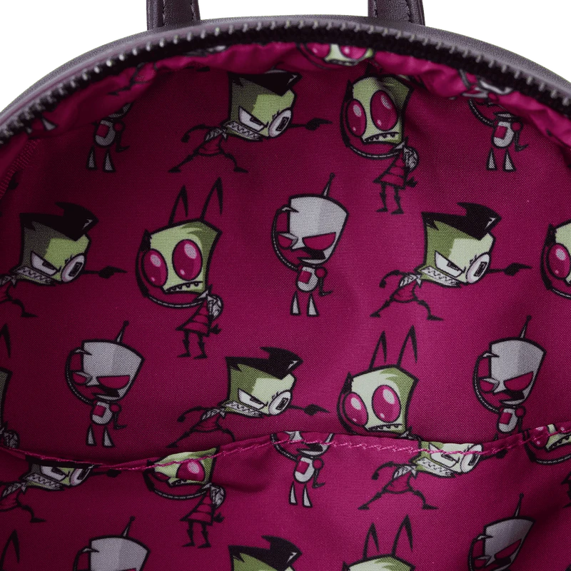 The Loungefly Invader Zim Secret Lair Mini Backpack is made of vegan leather (polyurethane). Bag has adjustable shoulder straps and gunmetal-colored hardware. Additional features include applique, debossed, and printed details. Take note of the coordinating inside lining.