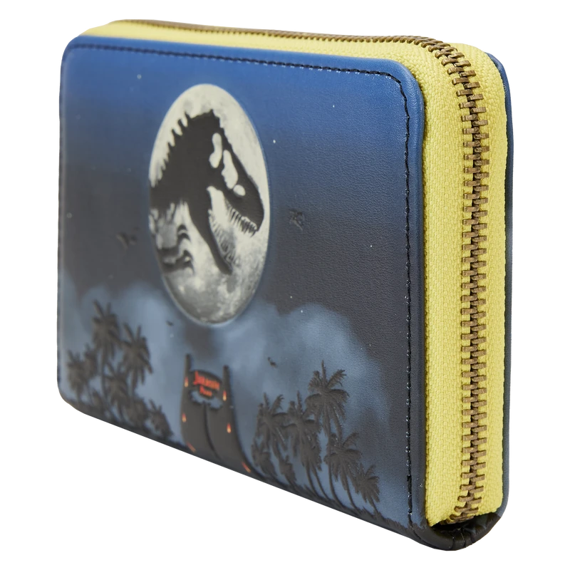 The Loungefly Jurassic Park 30th Anniversary Dino Moon Glow Zip Around Wallet is made of vegan leather (polyurethane). Wallet zips closed with sturdy metal hardware and features five card slots with a clear slot for holding ID. Additional features include embossed and printed details. Take note of the coordinating inside lining.