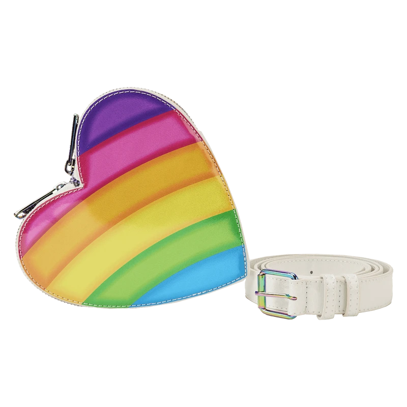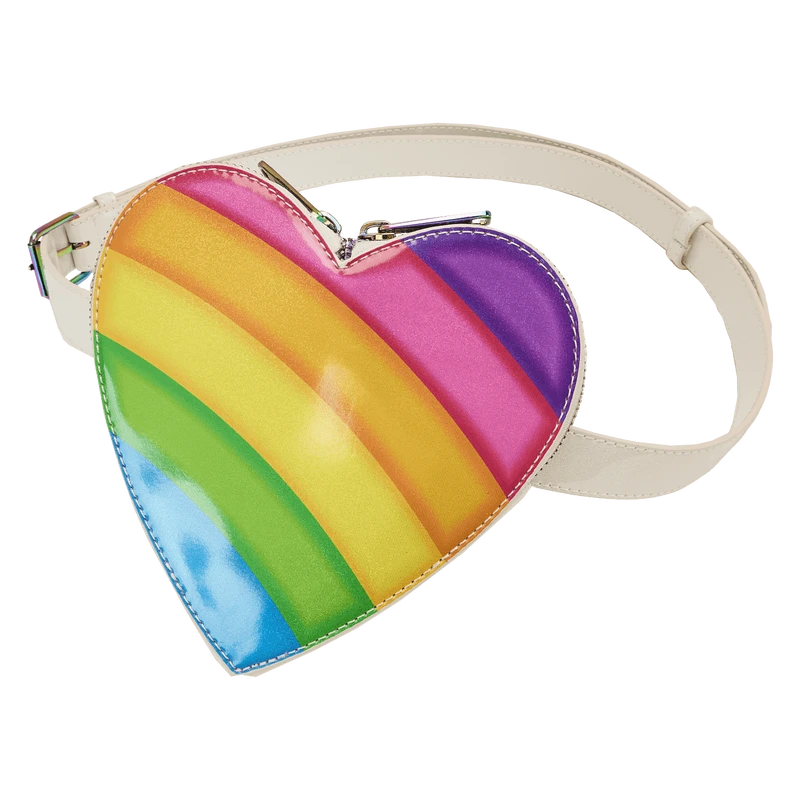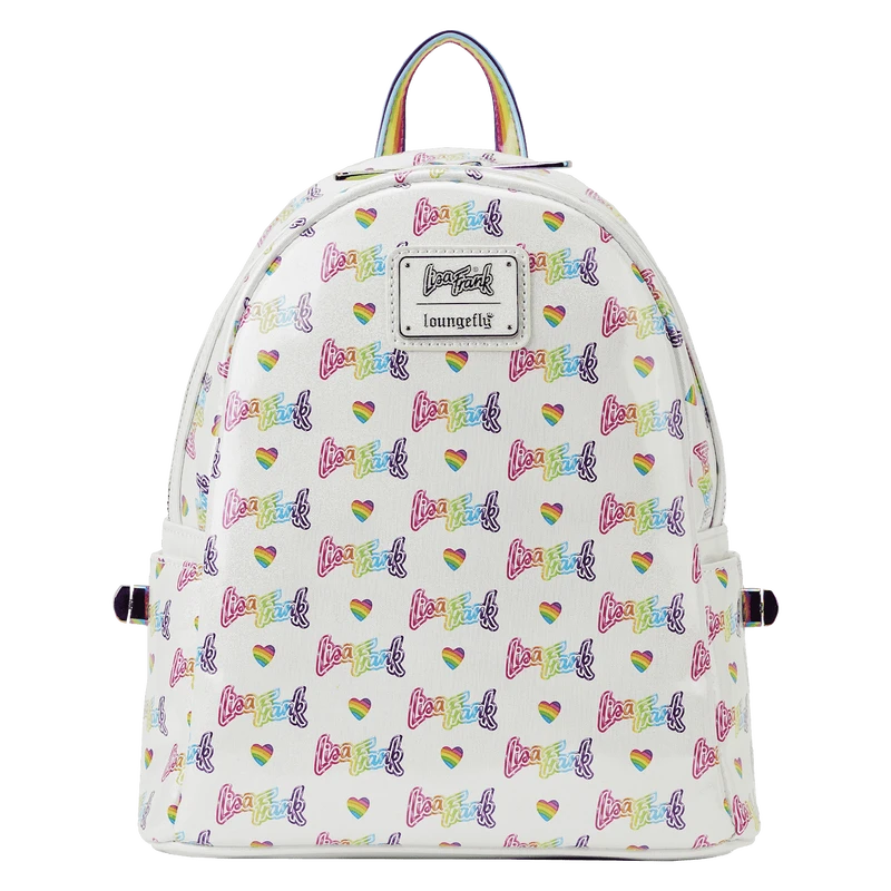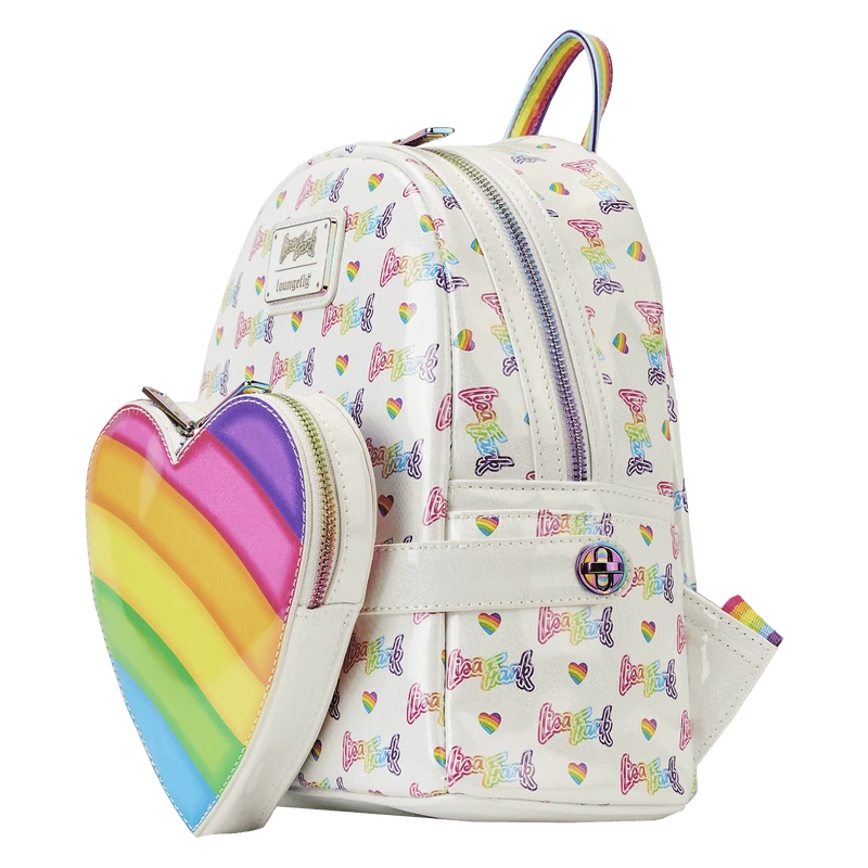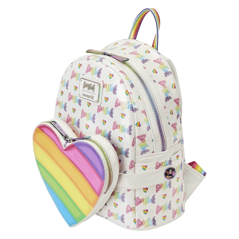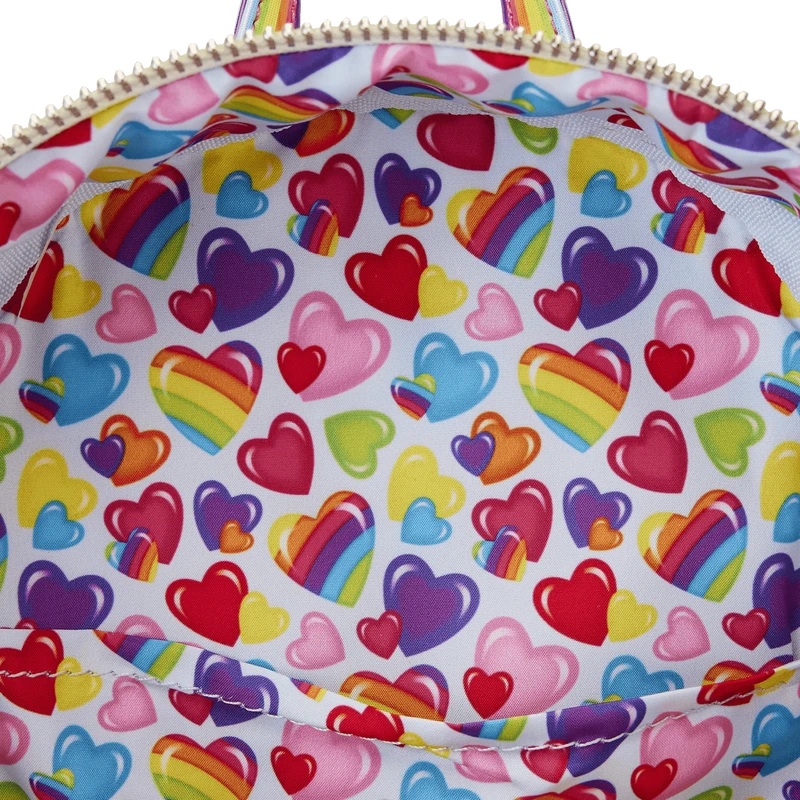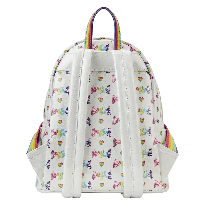 Backpack features include sturdy silver-colored metal hardware, adjustable rainbow straps, vegan leather (polyurethane), holographic glitter vegan leather, a detachable waist bag with adjustable straps, side pockets, and applique and printed details. Note the coordinating lining.