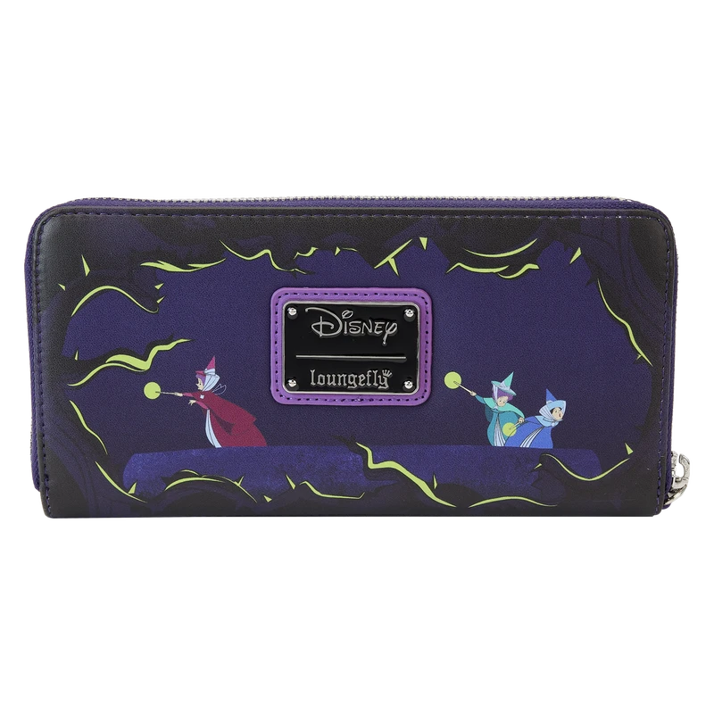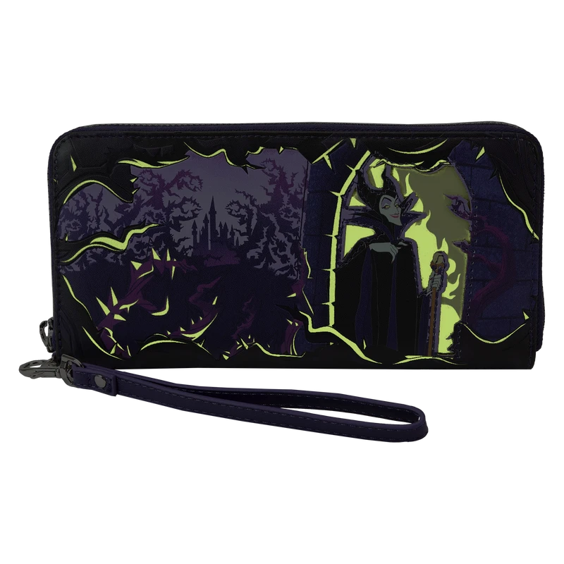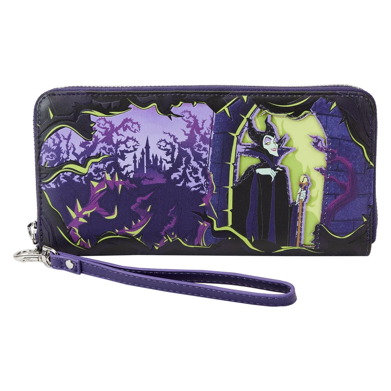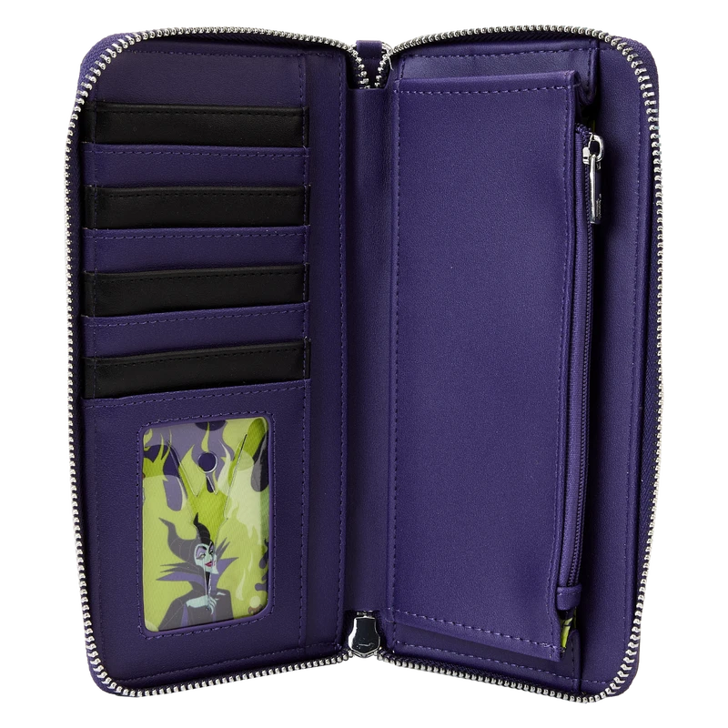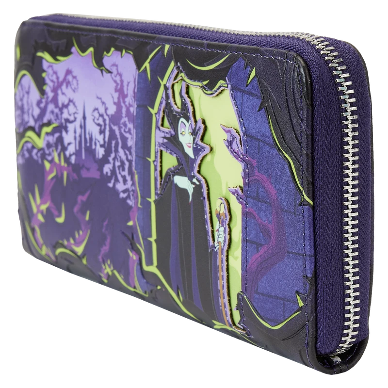 The Loungefly Disney Maleficent Window Box Zip Around Wallet Wristlet is made of vegan leather (polyurethane). Wallet zips closed with shiny silver-colored metal hardware. Additional features include applique, glow-in-the-dark, and printed details. Take note of the coordinating inside lining.