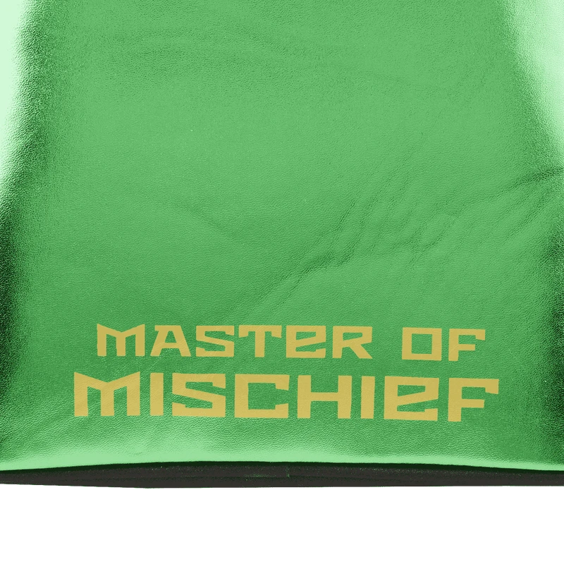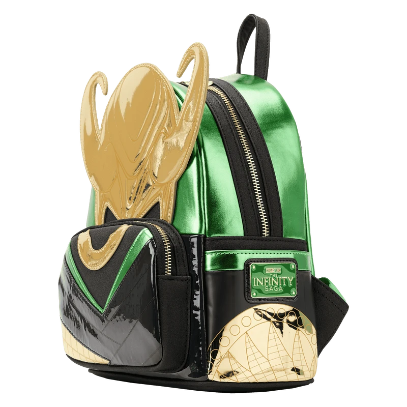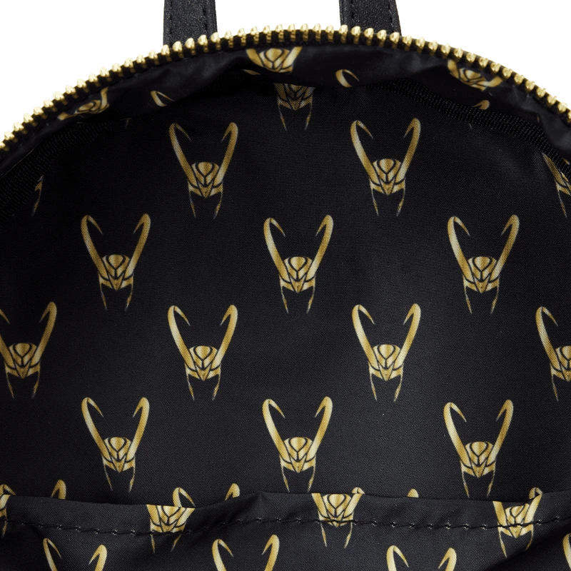The Loungefly Marvel Metallic Loki Mini Backpack is made of vegan leather (polyurethane). Bag has adjustable shoulder straps and shiny gold hardware. Additional features include applique, debossed, glitter, metallic, and printed details. Take note of the coordinating inside lining.