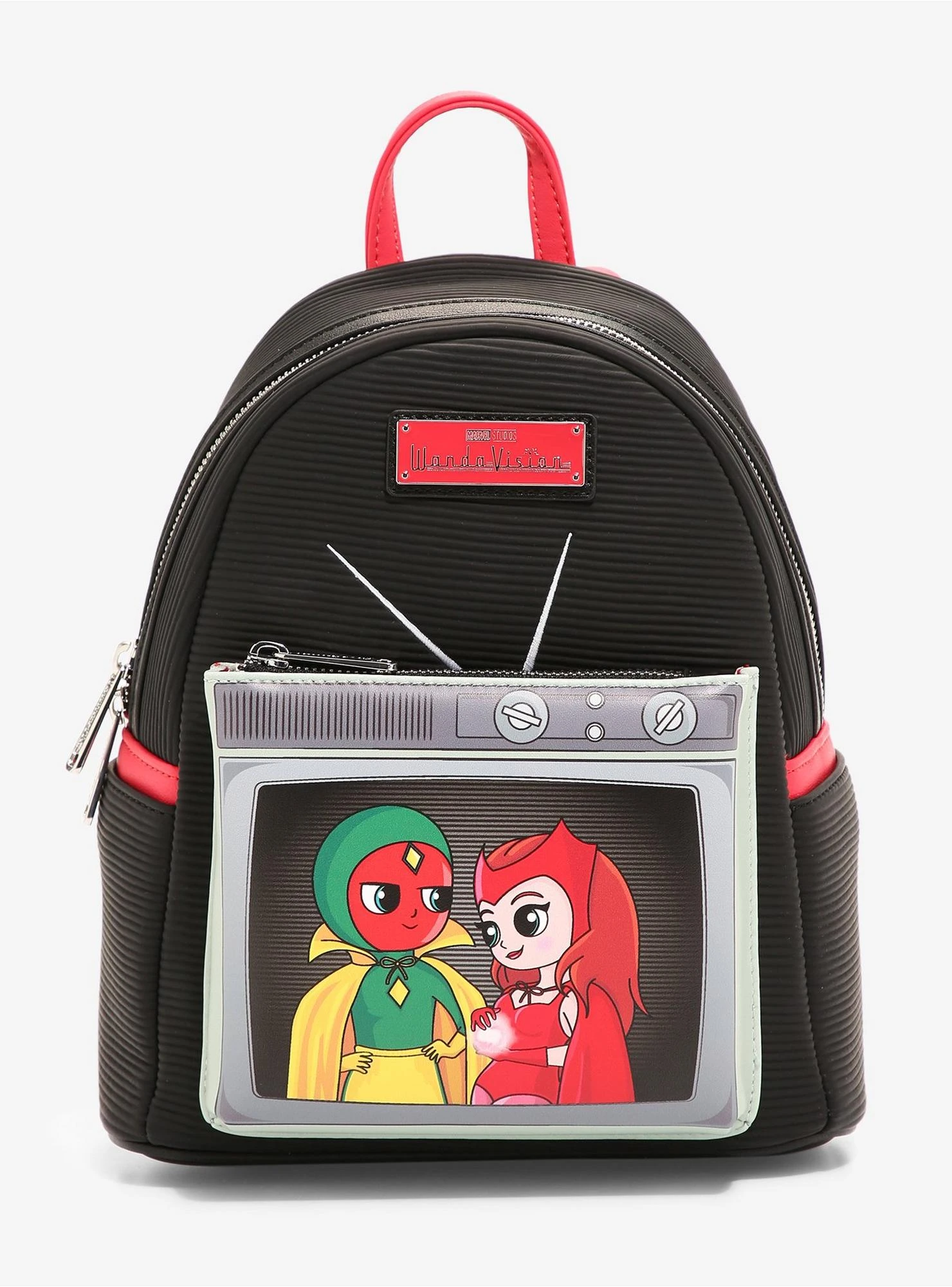 Add a bit of vintage Chaos Magic to your outings with this adorable Marvel mini backpack from Loungefly! Inspired by the hit series WandaVision now you can have a little help from Vision and Scarlet Witch herself when you’re carrying your daily necessities. With a front zippered pocket themed after a retro television, this mini backpack features a ribbed black design, silver-toned hardware, adjustable shoulder straps, vintage interior lining, enamel brand badge, and zippered interior pocket!
