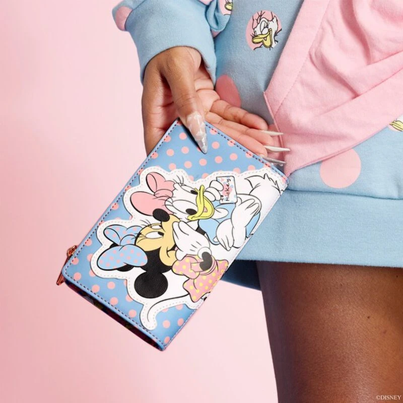 On the dot and always in style! We’re celebrating Minnie Mouse’s iconic 90s look with our Loungefly Minnie Mouse and Daisy Duck Pastel Color Block Dots Flap Wallet. Minnie and Daisy are teaming up for some fun! On the front, you’ll find Minnie whispering in Daisy’s ear. A field of blue, covered in pink polka dots, surrounds them in the background. On the back, a pink color block bursts with more polka dots, and scalloped trim adds a sweet touch. Inside, there are 4 slots on each side for holding cards, and a clear slot for holding your ID. Wherever you go, have fun totally rocking these dots!