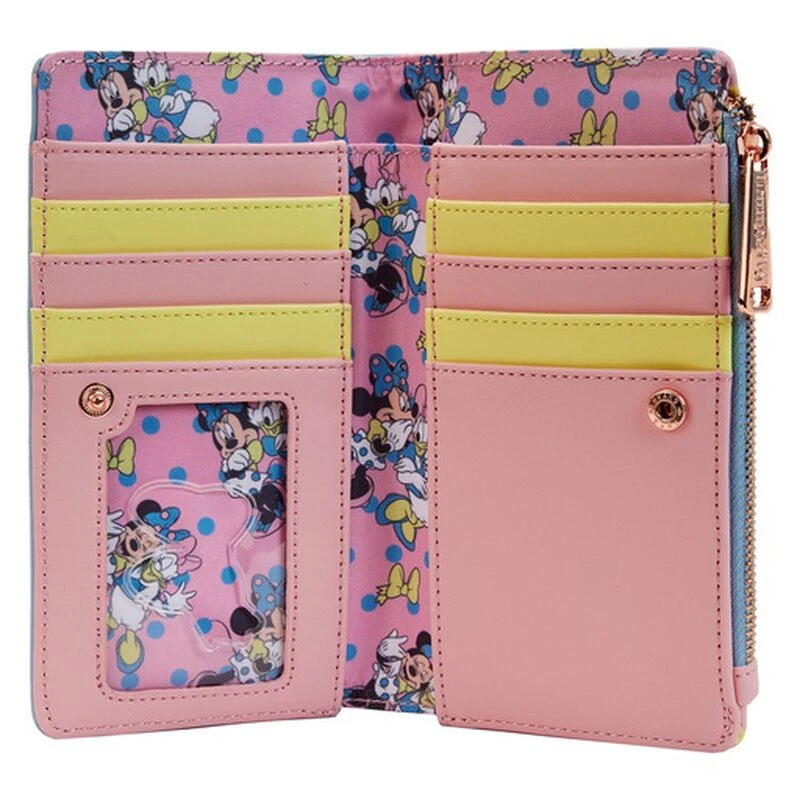 The Loungefly Disney Minnie Mouse and Daisy Duck Pastel Color Block Dots Flap Wallet is made of vegan leather (polyurethane). This bifold wallet has rose gold-colored metal snaps and zippers to keep everything in place. Additional features include applique and printed details. Take note of the coordinating inside lining.