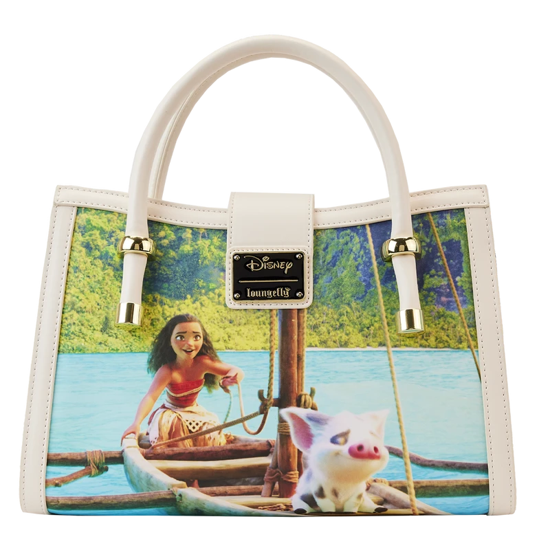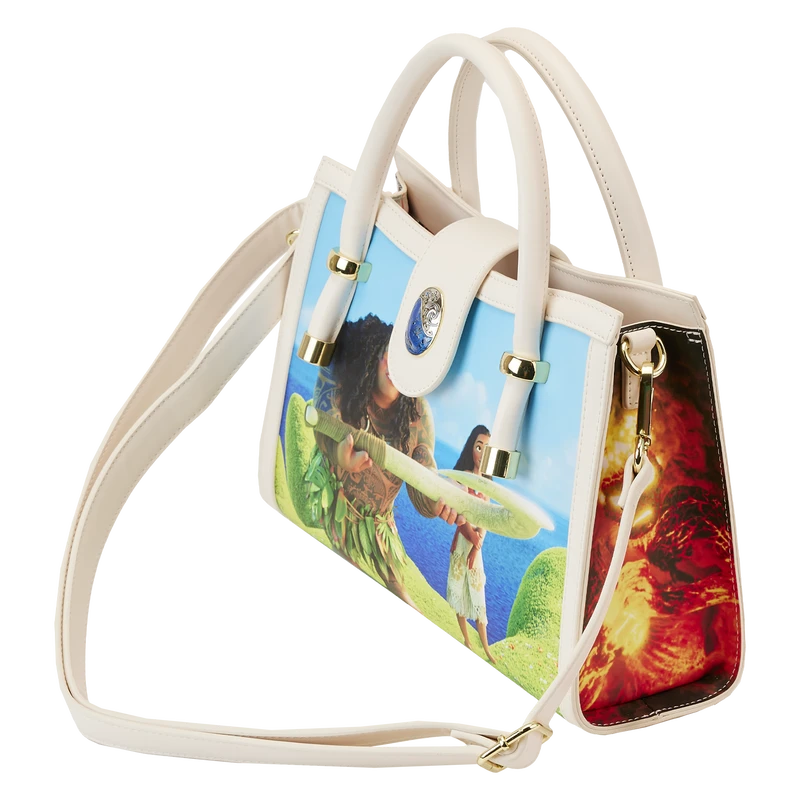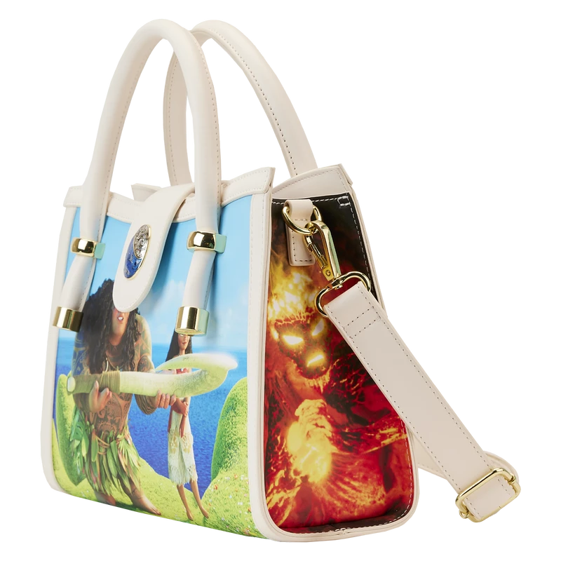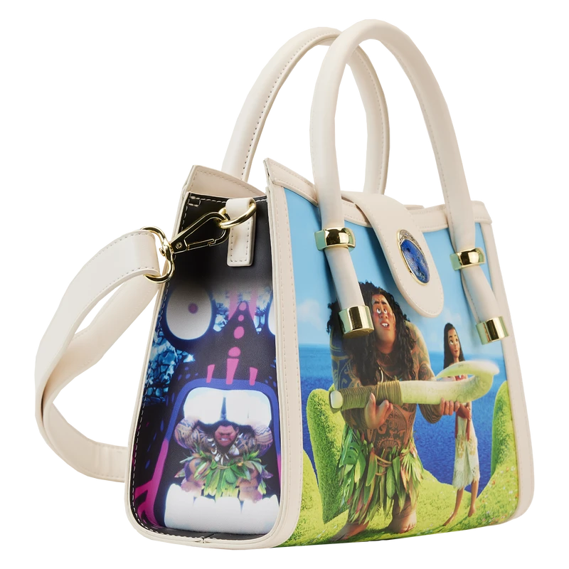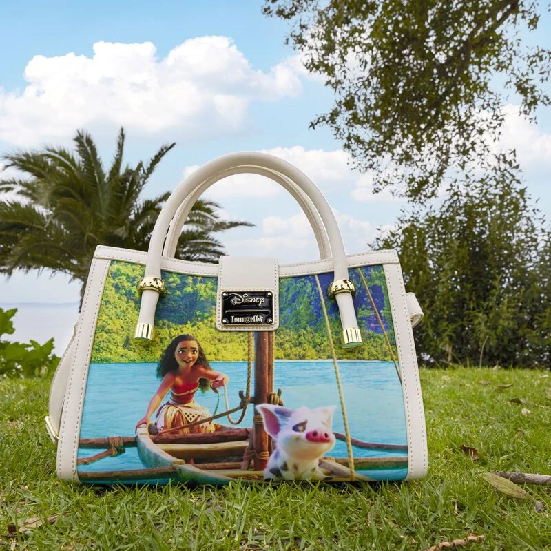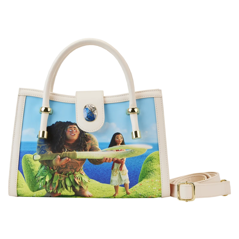 Journey beyond the reef in style with our Loungefly Disney Moana Princess Scene Series Crossbody Bag. Original, hand-drawn art brings each scene from this movie into focus. On the front, Moana and Maui stand on the outstretched hand of Te Fiti, as Maui shows his gratitude after having just received his fishhook. At the top, the Heart of Te Fiti Stone serves as the clasp, and it shimmers in blue with iridescent enamel. The side panels contain richly detailed art as well. You’ll find Te Kā on one side and Maui with a very menacing Tamatoa on the other. On the back, Moana and Pua travel the ocean in Moana’s boat. Wherever you go, make waves with this gorgeous crossbody bag.