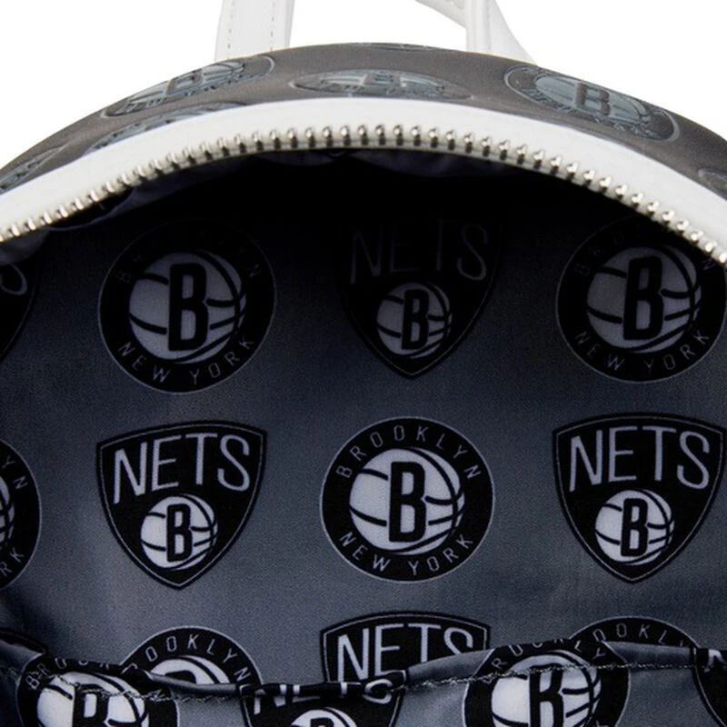 Create a winning game plan that shows your team spirit with this NBA Brooklyn Nets Logo Mini Backpack. The embroidered logo patch for the Brooklyn Nets prominently appears above the front zipped compartment. The logo includes a shield, with the word “NETS” arcing over a white basketball, with a black “B” in the middle. A debossed motif of another Brooklyn Nets logo—a black B encircled by the words “Brooklyn New York” in all capital letters— is set against a black background. White trim adds accent and contrast in team uniform color.