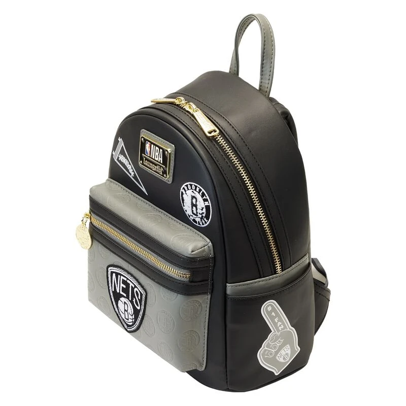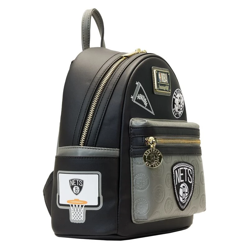 The Loungefly NBA Brooklyn Nets Patch Icons Mini Backpack is made of vegan leather (polyurethane). Bag has adjustable shoulder straps and sturdy metal hardware. Additional features include applique, debossed, and printed details. Take note of the coordinating inside lining.