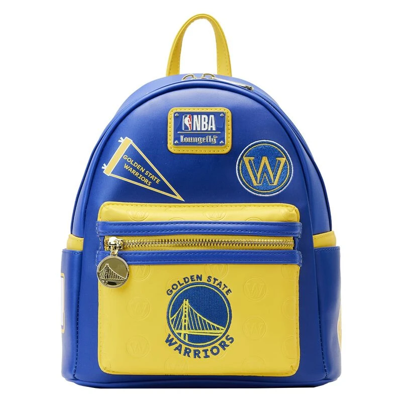 Cheer on your favorite team with a game-winning play for your collection! The Loungefly NBA Golden State Warriors Patch Icons Mini Backpack features chenille and embroidered patches on the front and side pockets of the bag. The Warriors logo appears in a debossed pattern that covers the front zipper pocket and appears as a shiny gold zipper charm, providing easy access to your game-day essentials. Turn the bag around to see the team’s logo make an encore appearance on the back. Whether you’re watching from home or on the sidelines, this stylish mini backpack has plenty of room to carry your gear while sporting your team spirit.