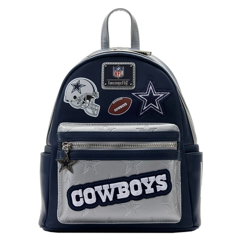 The Loungefly NFL Dallas Cowboys Patches Mini Backpack is made of vegan leather (polyurethane). Bag has adjustable shoulder straps and sturdy metal hardware. Additional features include applique patches, embroidered, debossed, and printed details. Take note of the coordinating pattern of the inside lining.