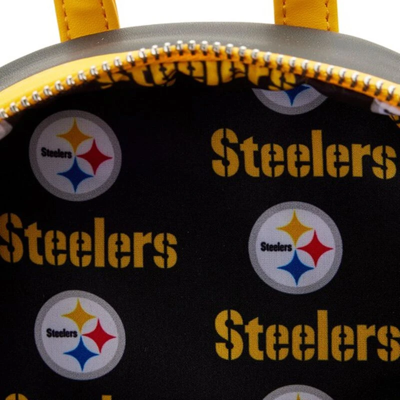 Show your team spirit with a game-winning play for your Loungefly collection! The NFL Pittsburg Steelers Patches Mini Backpack is a touchdown for any Steelers fan. This black backpack features sporty chenille and embroidered patches along the top and side pockets. The team’s logo is displayed in a debossed pattern across the front zipper pocket along with a rubber patch of the team’s name. An enamel Steelers zipper charm provides easy access to your gameday essentials, and the NFL logo appears on the back of the bag. This stylish mini backpack has plenty of room to carry your gear as you cheer from the sidelines and makes a sporty addition to any outfit.