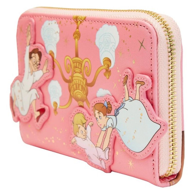 Think happy thoughts and your dreams will take flight! The Loungefly Peter Pan You Can Fly 70th Anniversary Zip Around Wallet sets a scene from the Disney animated classic. On the front, the Darling siblings soar across the ceiling of their bedroom. On the back, Tinker Bell pouts while sitting on a toy block. With five slots for holding cards and a clear slot to hold ID, this whimsical accessory will keep your belongings safe on any adventure.