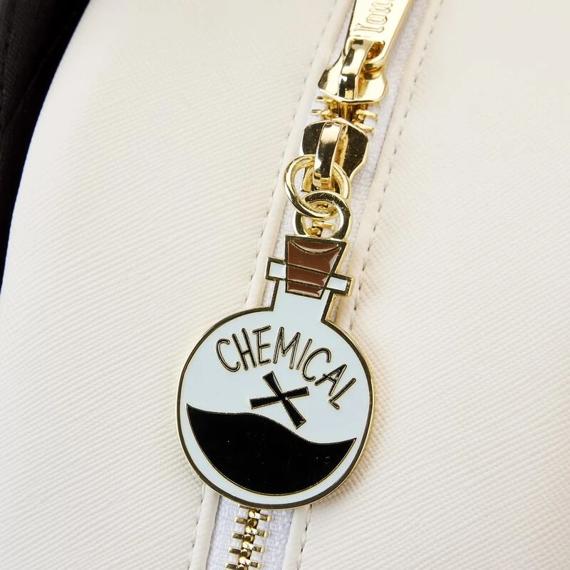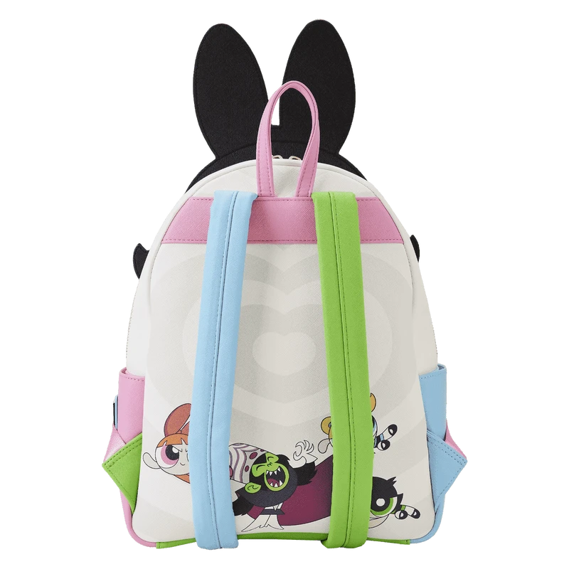 The Loungefly Powerpuff Girls Triple Pocket Backpack is made of vegan leather (polyurethane). Bag has adjustable shoulder straps and sturdy metal hardware. Additional features include applique, debossed, and printed details. Take note of the coordinating inside lining.