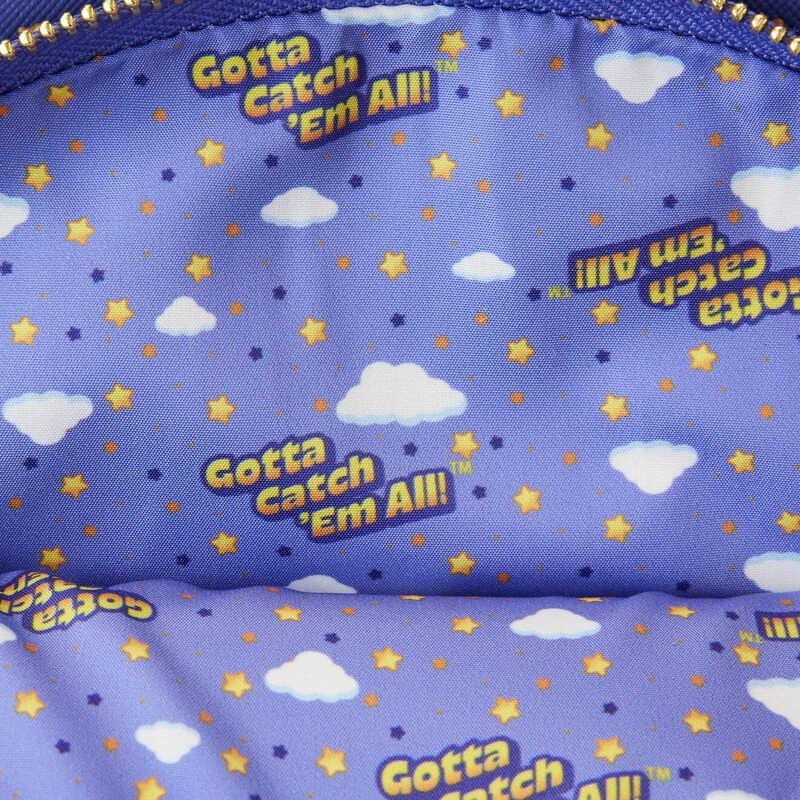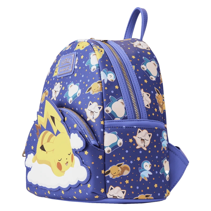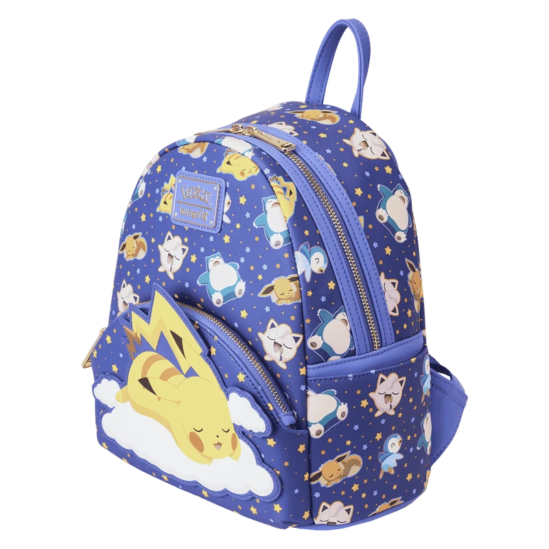 The Loungefly Sleeping Pikachu and Friends Mini Backpack is made of vegan leather (polyurethane). Bag has adjustable shoulder straps and shiny gold hardware. Additional features include applique and printed details. Take note of the coordinating inside lining.