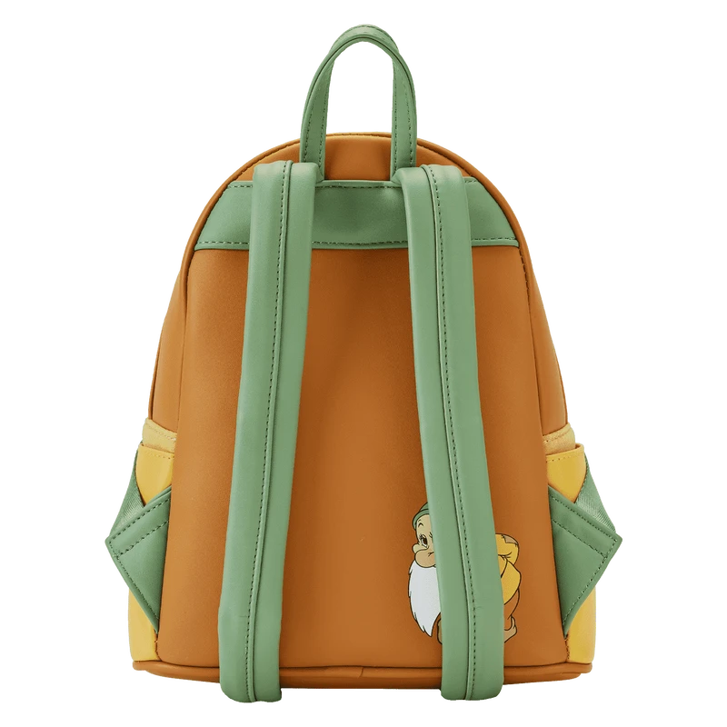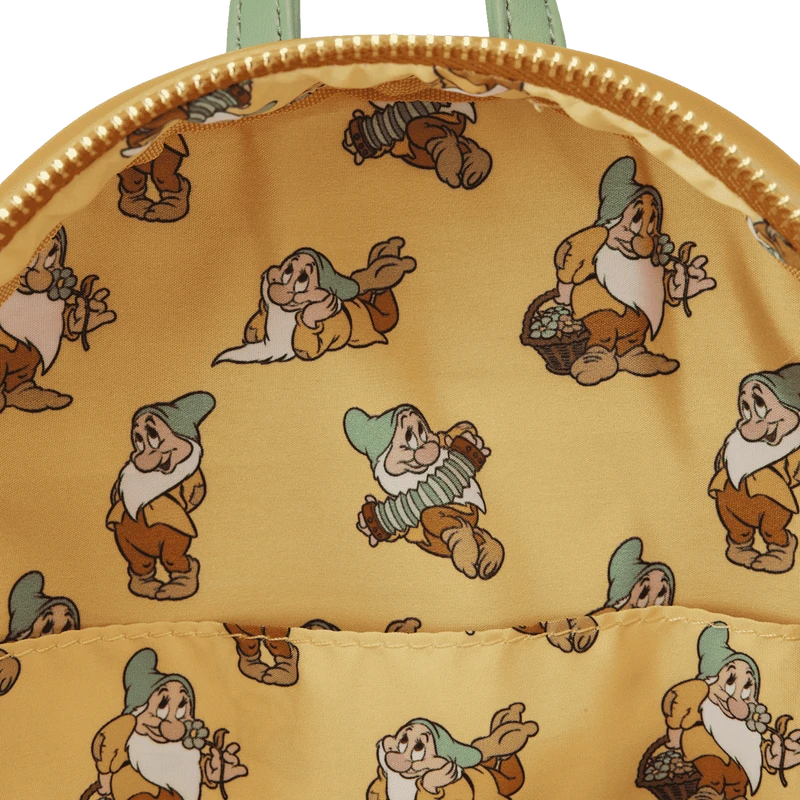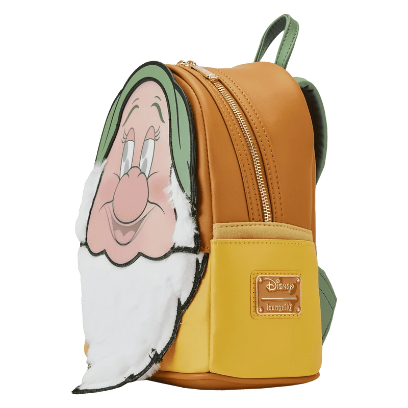 Backpack features include shiny gold-colored metal hardware, adjustable straps, vegan leather (polyurethane), side pockets, and applique, debossed, faux fur, lenticular, and printed details. Note the coordinating lining.