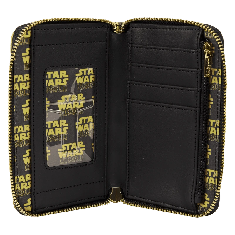 Test the limits of what it means to be a Jedi. The Loungefly Star Wars: Episode II – Attack of the Clones Scene Zip Around Wallet features cinematic moments from the legendary middle chapter of the prequel trilogy. On the front, Obi-Wan Kenobi™ and Mace Windu™ face off against an attack. On the back, Count Dooku™ battles Master Yoda™. With four slots for holding cards and a clear slot to hold ID, this galactic accessory is the perfect addition to any Star Wars™ collection.