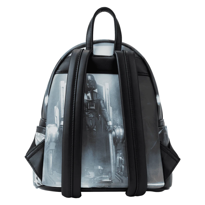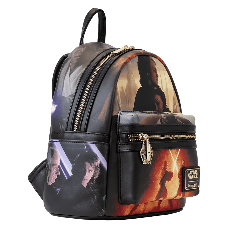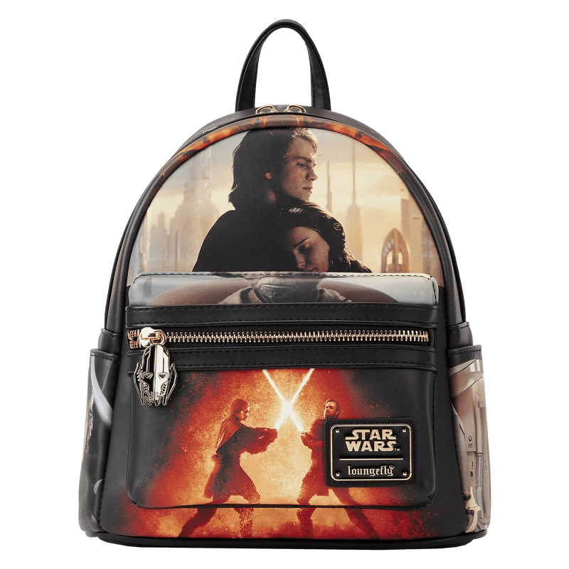The Loungefly Star Wars: Episode III – Revenge of the Sith Scene Mini Backpack is made of vegan leather (polyurethane). Bag has adjustable shoulder straps, sturdy metal hardware, and features printed details. Take note of the coordinating inside lining.