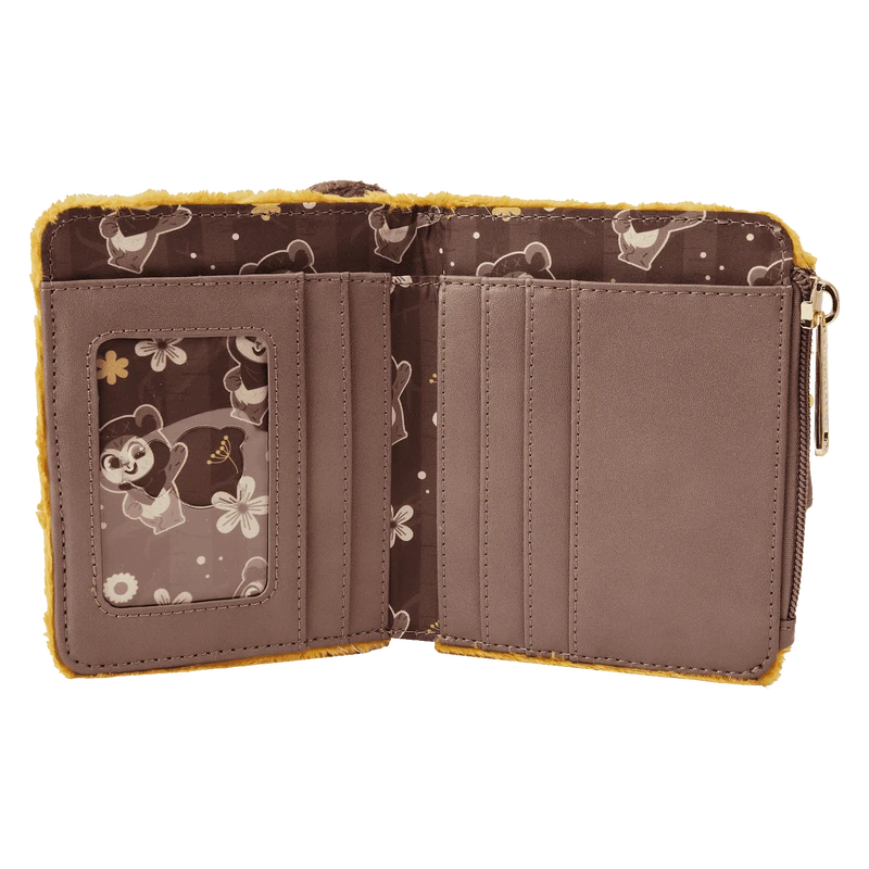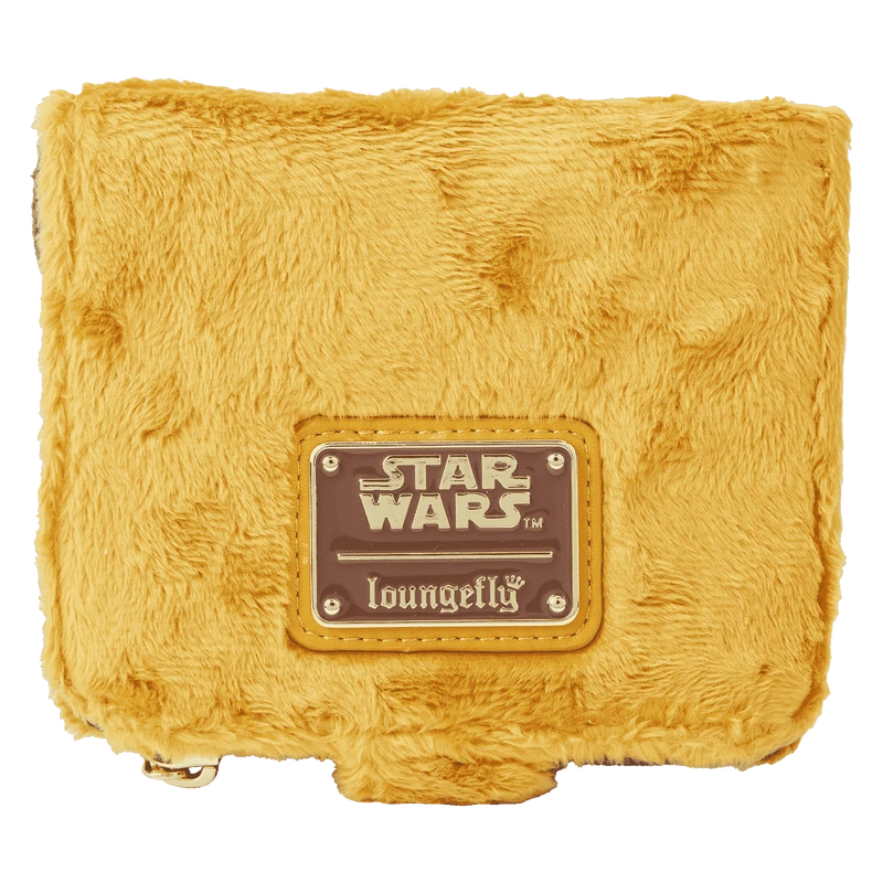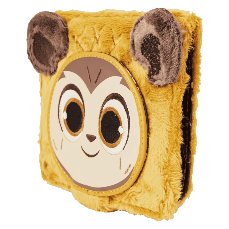 The exclusive Loungefly Plush Wicket Bifold Wallet is made of vegan leather (polyurethane) with plush trim. Wallet snaps closed with shiny gold hardware. Additional features include applique, embroidered, and printed details. Take note of the coordinating inside lining.