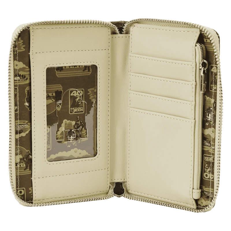 The Loungefly Star Wars™: Return Of The Jedi™ Jabba’s Palace Zip Around Wallet is made of vegan leather (polyurethane). Additional features include 5 slots for holding cards, a clear slot for holding ID, and printed details. Take note of the coordinating inside lining.