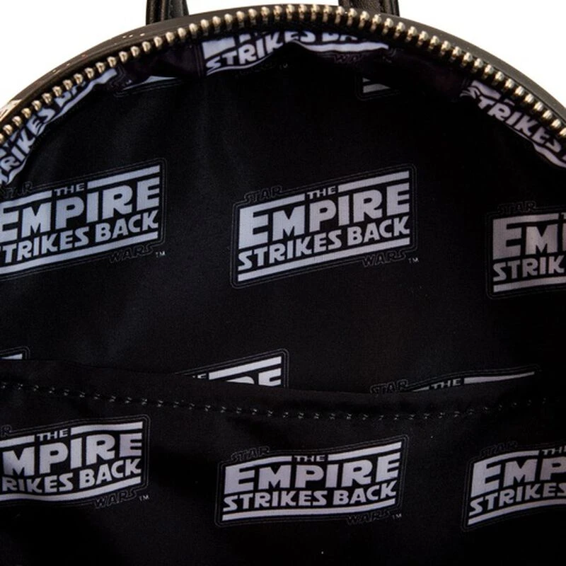 The Loungefly Star Wars: The Empire Strikes Back Final Frames Mini Backpack is made of vegan leather (polyurethane). Bag has adjustable shoulder straps, sturdy metal hardware, and features printed details. Take note of the coordinating inside lining.