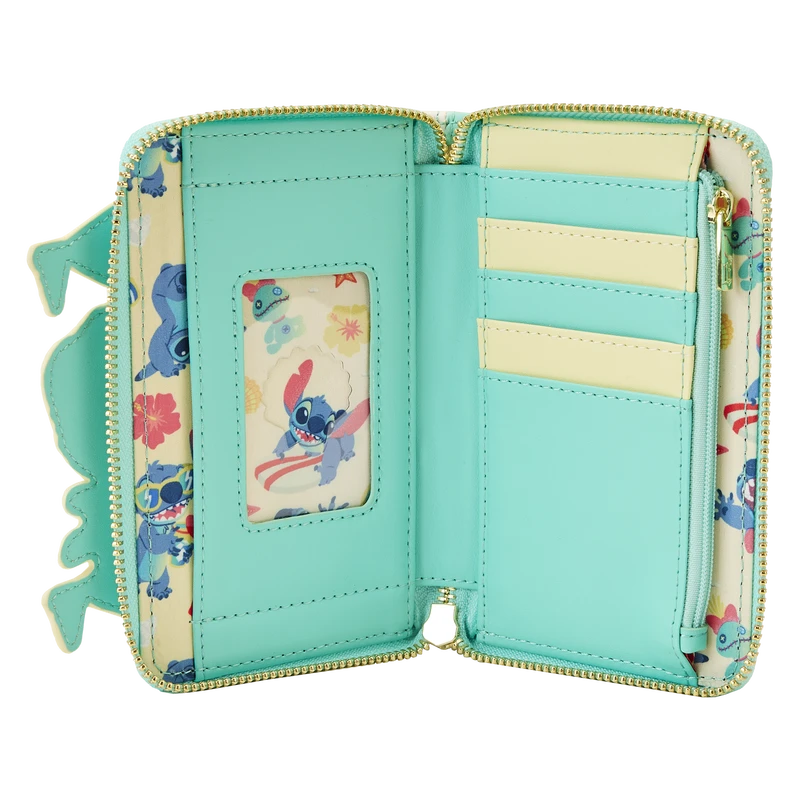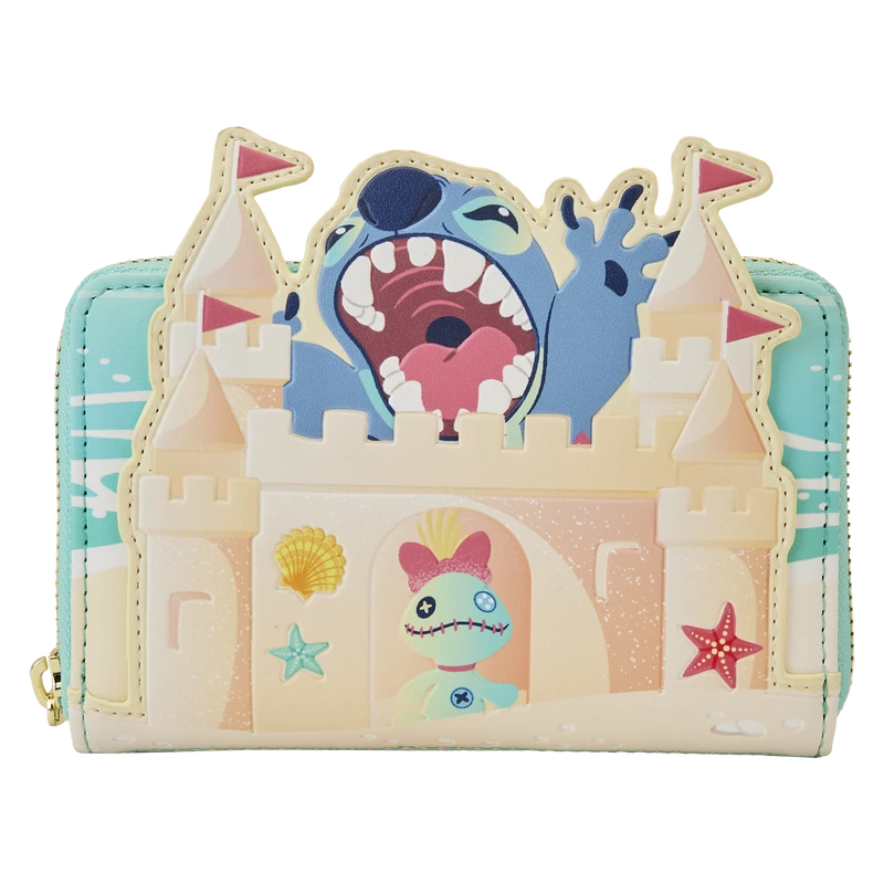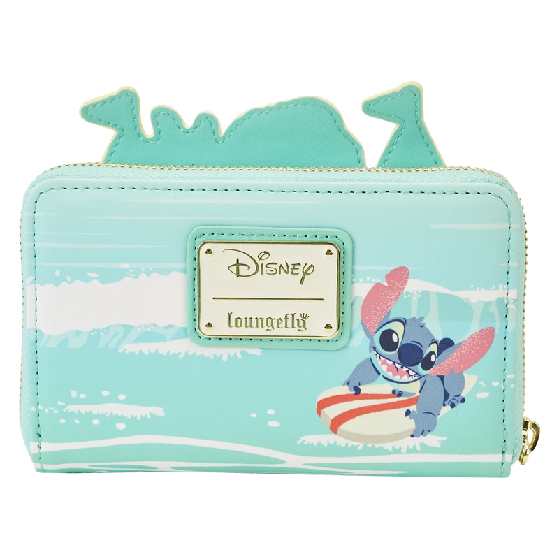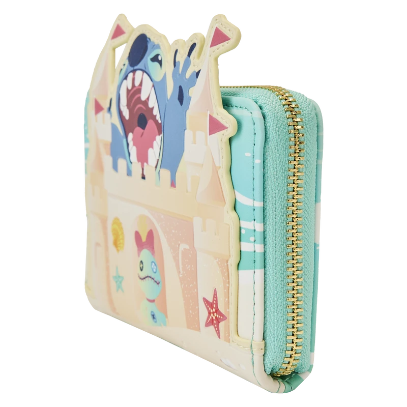 The Loungefly Disney Stitch Sandcastle Beach Surprise Zip-Around Wallet is made of vegan leather (polyurethane). Wallet zips closed with shiny gold-colored metal hardware. Additional features include applique, embossed, and printed details. Take note of the coordinating inside lining.