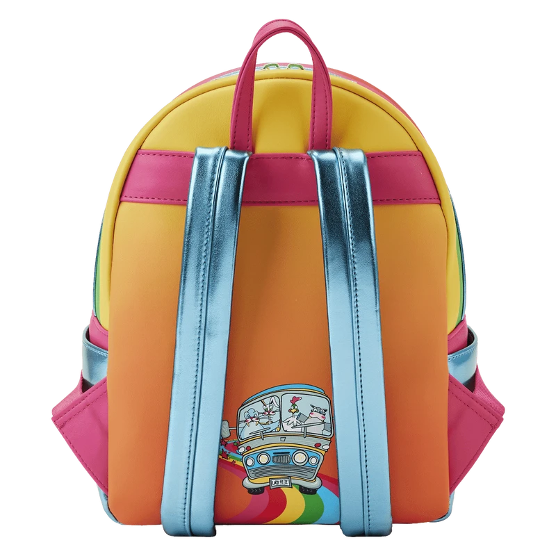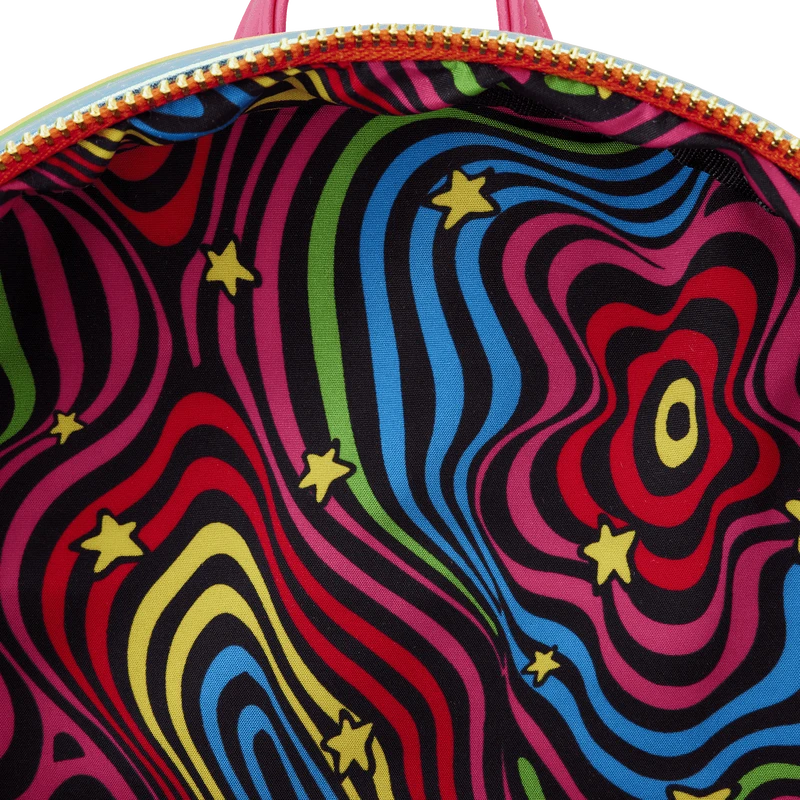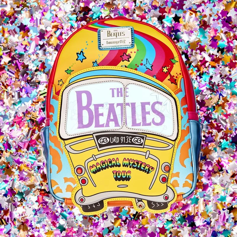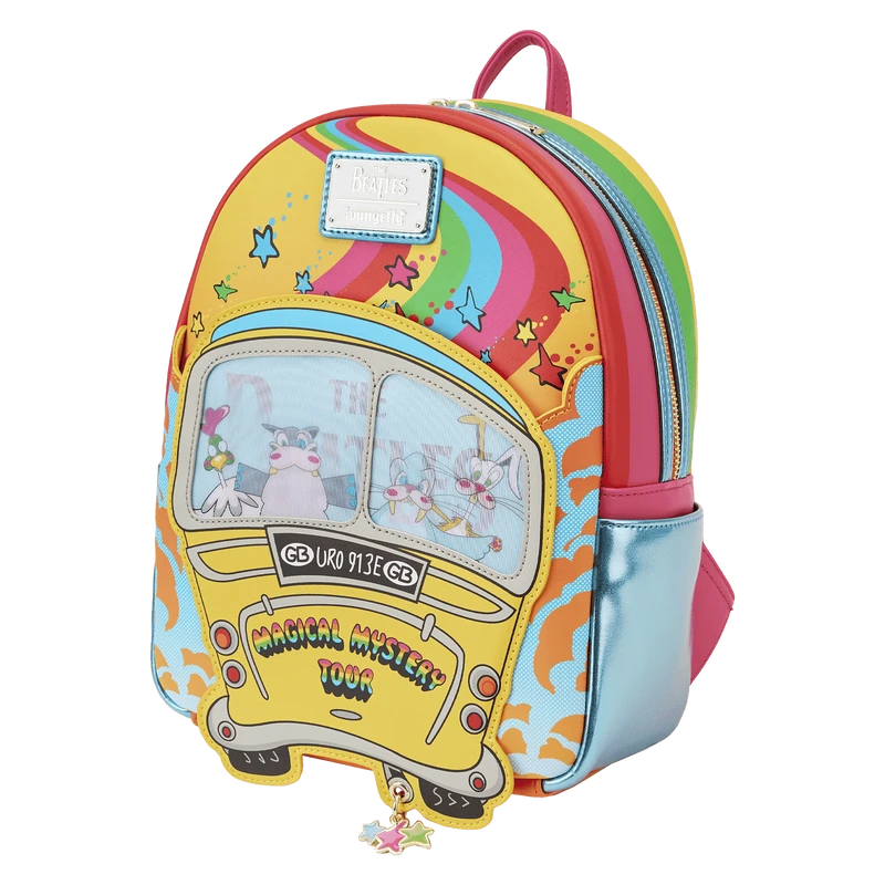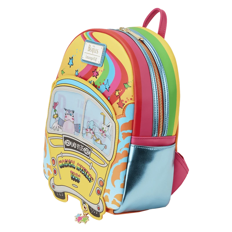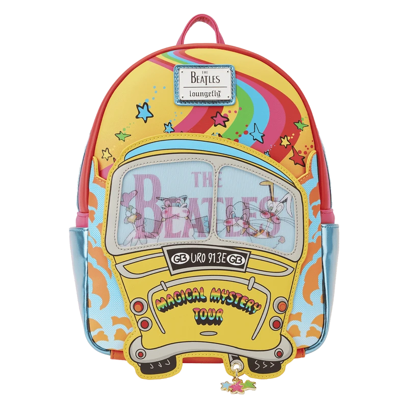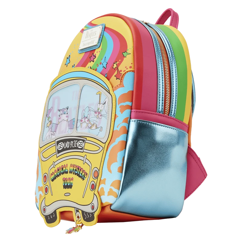 The Loungefly The Beatles Magical Mystery Tour Bus Mini Backpack is made of vegan leather (polyurethane). Bag has adjustable shoulder straps and shiny gold hardware. Additional features include applique, embossed, lenticular, and printed details. Take note of the coordinating inside lining.