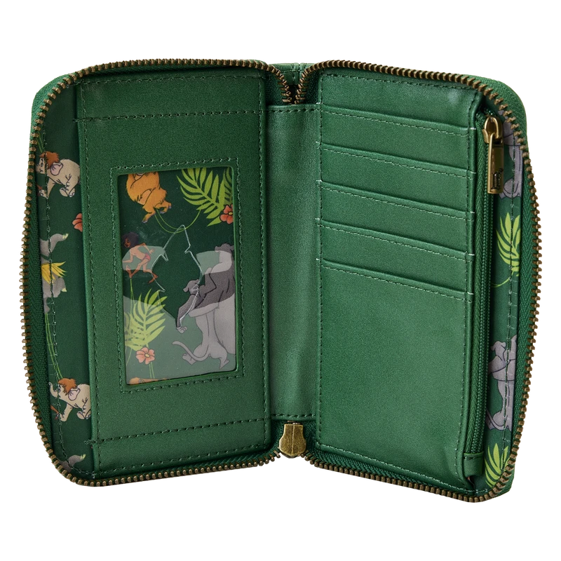 The Loungefly Disney The Jungle Book Zip Around Wallet is made of vegan leather (polyurethane). Wallet zips closed, has sturdy brass hardware, and features debossed, gold-foil, and printed details. Take note of the coordinating pattern of the inside lining fabric.