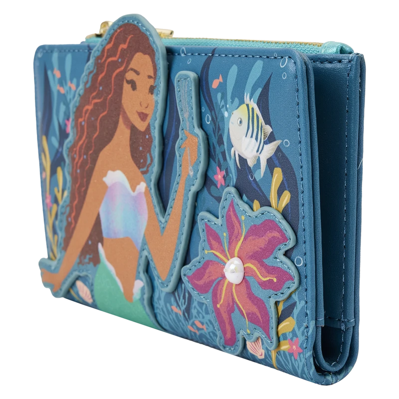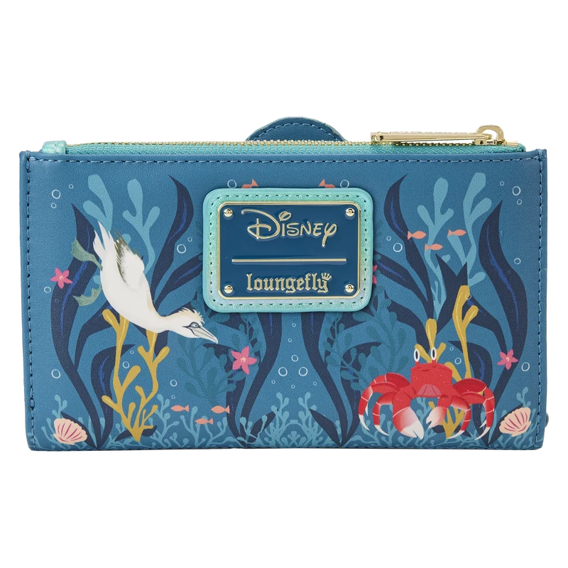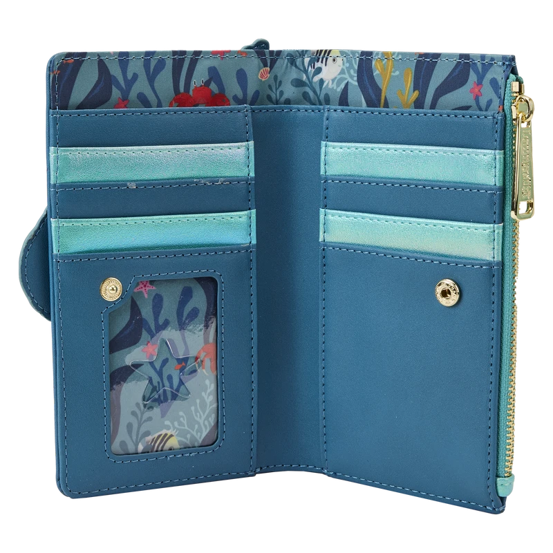 Explore life under the waves in an inspiring new way. The Loungefly Little Mermaid Live Action Flap Wallet displays beautiful in-house artwork of Ariel as she swims beneath the sea. Turn the wallet in the light to see iridescent details shine on Ariel’s tail and other underwater details. On the back, Scuttle and Sebastian drift through seaweed, coral, and seashells. Perfect for adventures on land or sea, this oceanic accessory will keep your gadgets and gizmos safe on any journey.