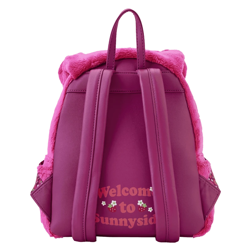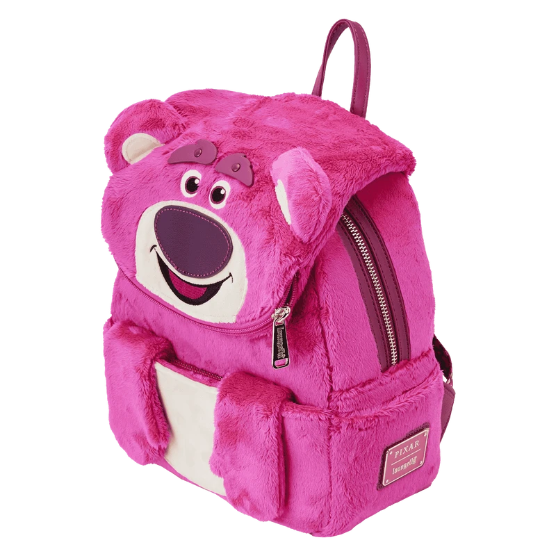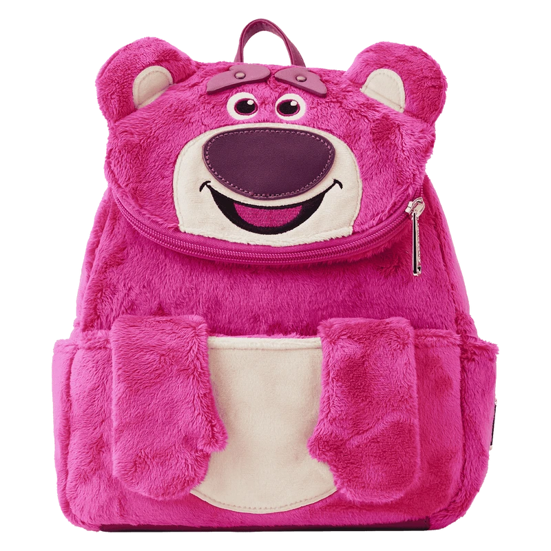 The exclusive Loungefly Toy Story Lotso Plush Pocket Mini Backpack is made of plush with vegan leather (polyurethane) trim. Bag has adjustable shoulder straps and shiny gold hardware. Additional features include applique, embroidered, scented, and printed details. Take note of the coordinating inside lining.