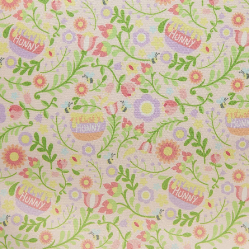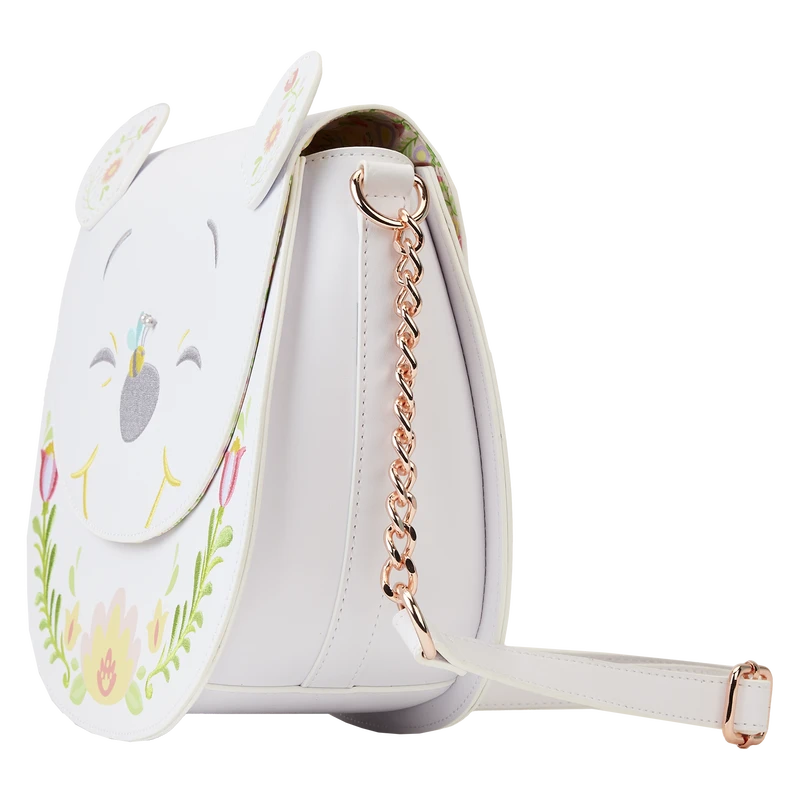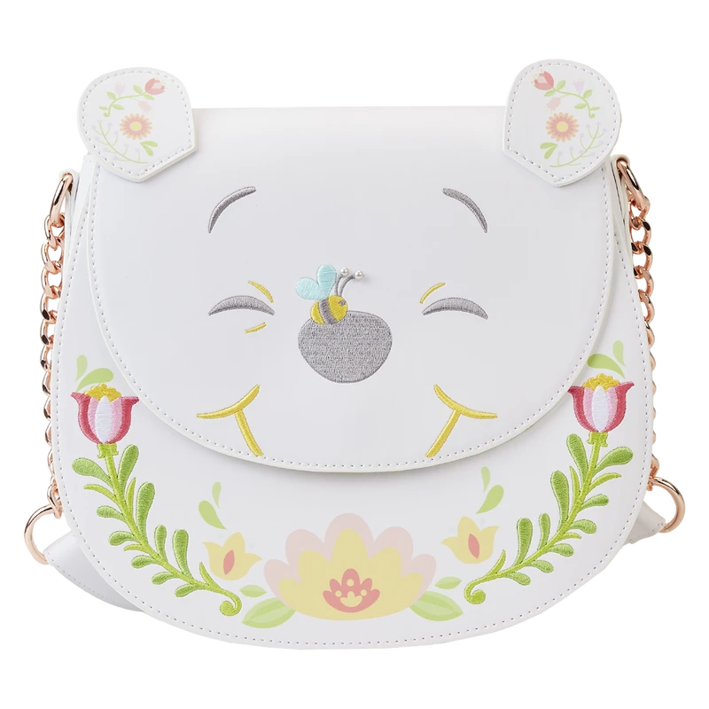 The Loungefly Disney Winnie the Pooh Cosplay Folk Floral Crossbody Bag is made of vegan leather (polyurethane). Bag has adjustable (detachable) shoulder strap and rose gold-colored metal chain and hardware. Additional features include applique, embroidered, beaded, and printed details. Take note of the coordinating inside lining.